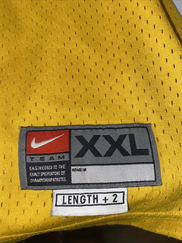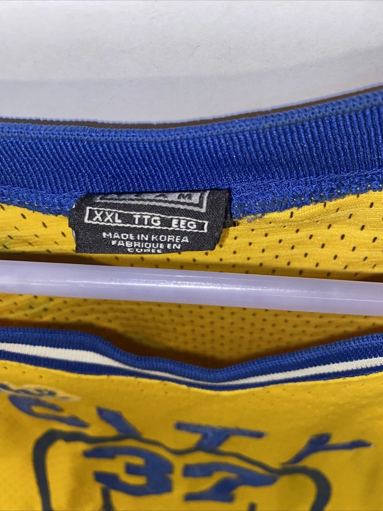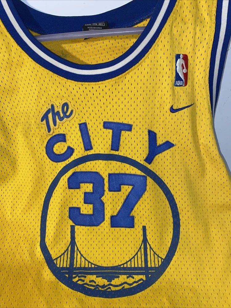This vintage Nike jersey features Nick Van Exel's number 37 from his time with the Golden State Warriors. The yellow jersey is a size 2XL and made for men. It is an officially licensed product and was manufactured in Korea, Republic of. The jersey is perfect for fans of the National Basketball Association (NBA) and collectors of sports memorabilia. It is a great way to show support for the Golden State Warriors and nickname "The City" on game day. This item is a must-have for any basketball enthusiast.