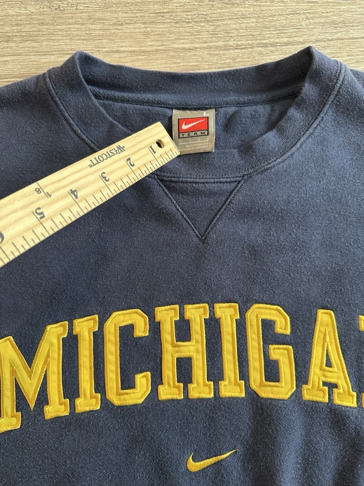 Embrace the nostalgia with this Vintage Y2K Nike Michigan NCAA Crewneck Sweatshirt. A true testament to the early 2000s sportswear, it features a classic check pattern in a striking blue hue, complemented by the iconic Nike embroidery. The long-sleeve pullover design offers a relaxed fit for all-day comfort, making it a versatile addition to any wardrobe. Crafted from a cozy cotton blend with a soft fleece fabric type, this sweatshirt is perfect for a range of activities, from casual outings to college sports events. Its crew neck and embroidered accents bring a timeless collegiate vibe, while the all-season feature ensures it's suitable no matter the weather. Whether you're a basketball fan or just looking for a retro fashion piece, this sweatshirt hits the mark. Measurements shown in photos.