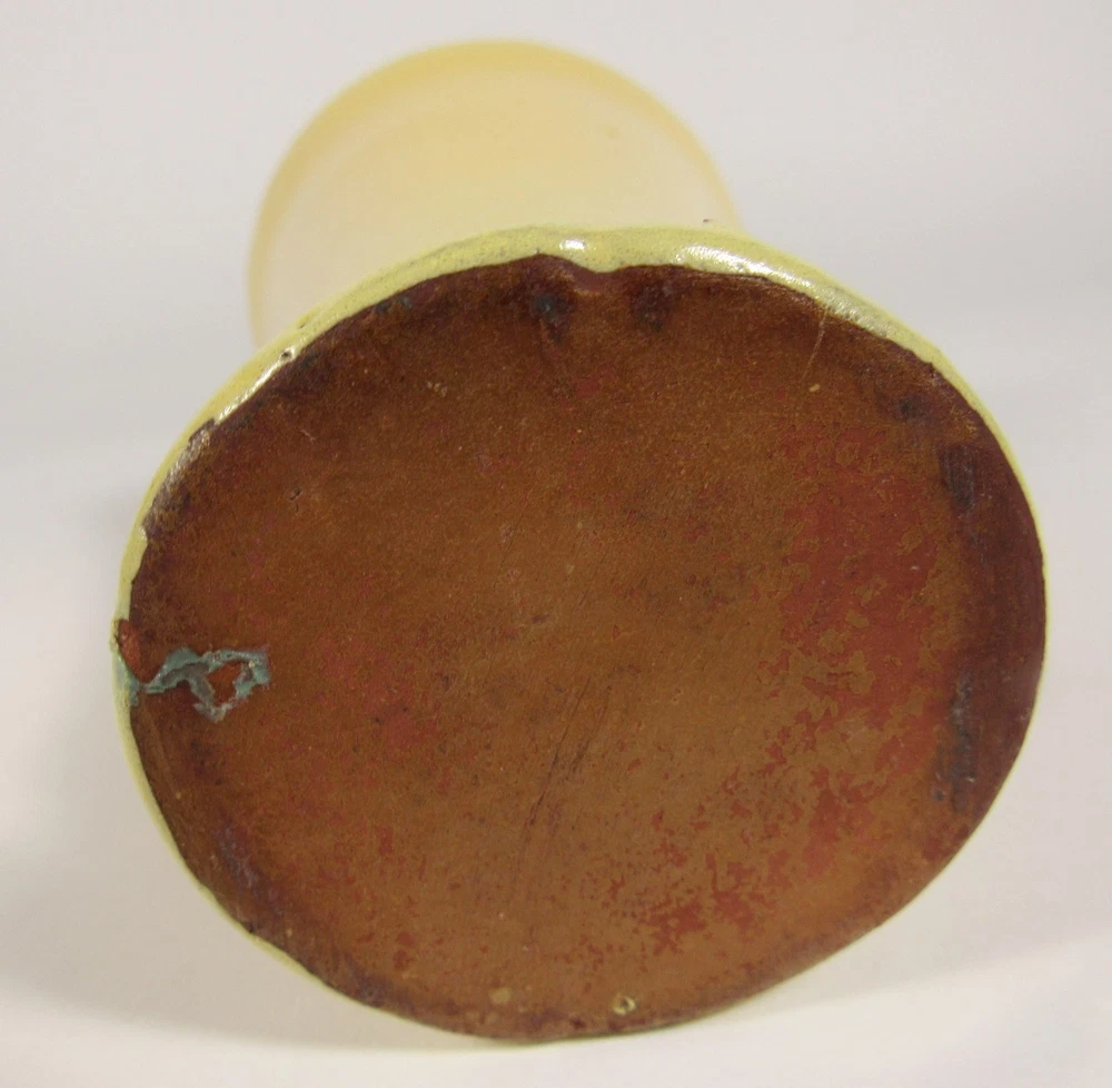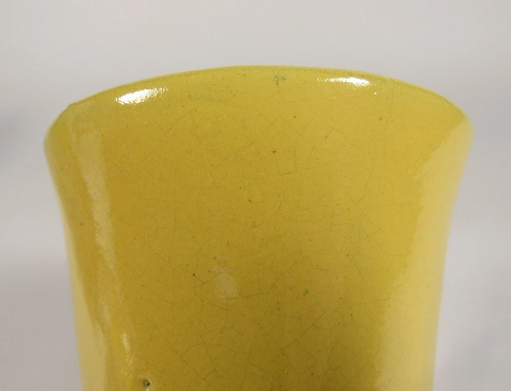 Description: This vintage pottery vase is approx.. 5 ¾” high x 3 ¾” widest point. It is glazed in a bright yellow over red clay. The piece is unmarked. There is a very tight line at the top rim into the interior approx.. 2” long and a couple of firing pops. Please view and zoom all photos.