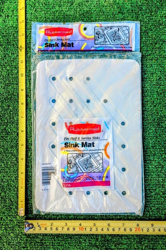 New-old-stock, mint condition. Vintage Rubbermaid Half Sink Mat Manufacturer #1298 Made in the USA Measures 11" x 7.5" x 0.25" fits half & service sinks-helps protect and cushion glassware and china. Flat White classic design. 8LFL