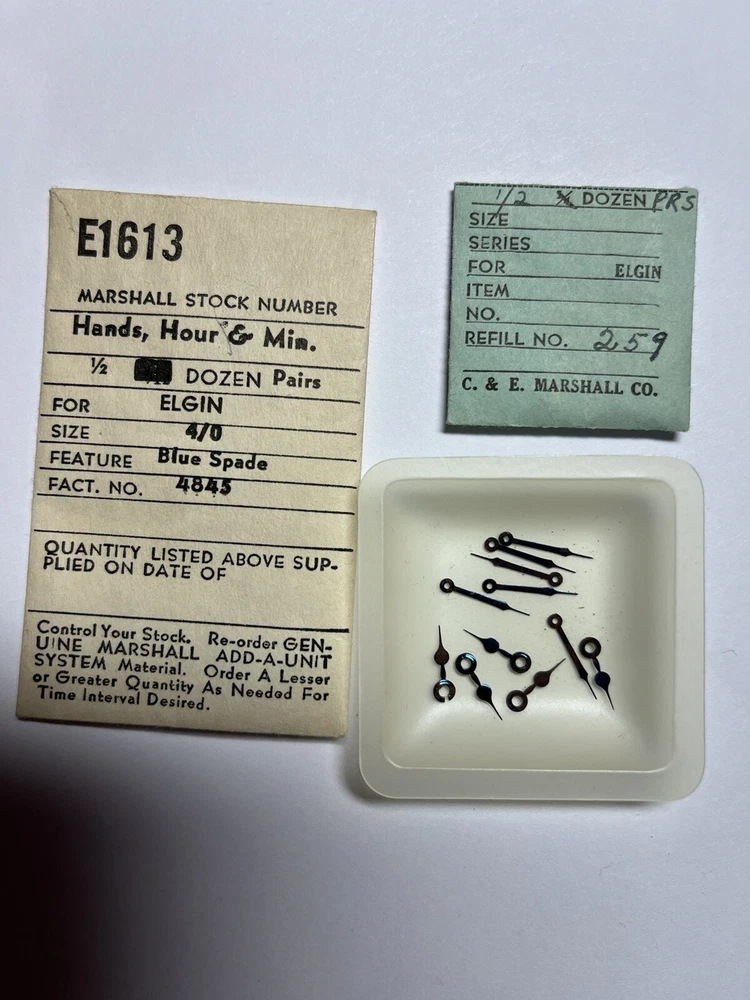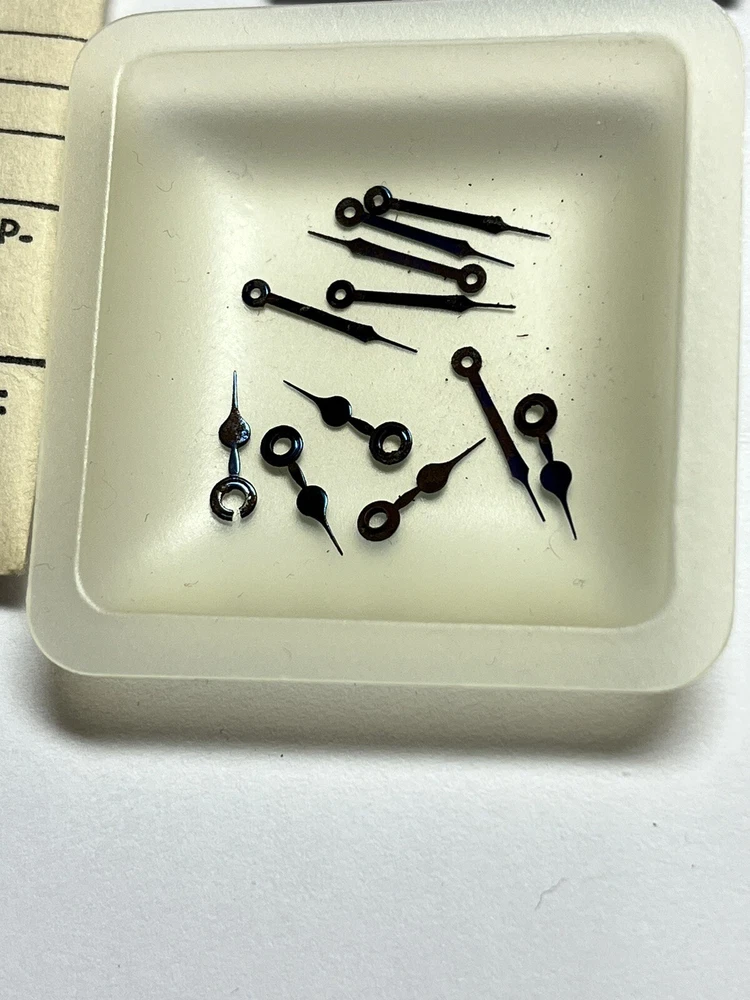 Vintage NOS Elgin 4845 Blued Pocket Watch Hour & Minute Hands Parts Lot You get all the hands in the pictures. Slight bit of rust on them. See pics. See pic for length. Thanks for looking.