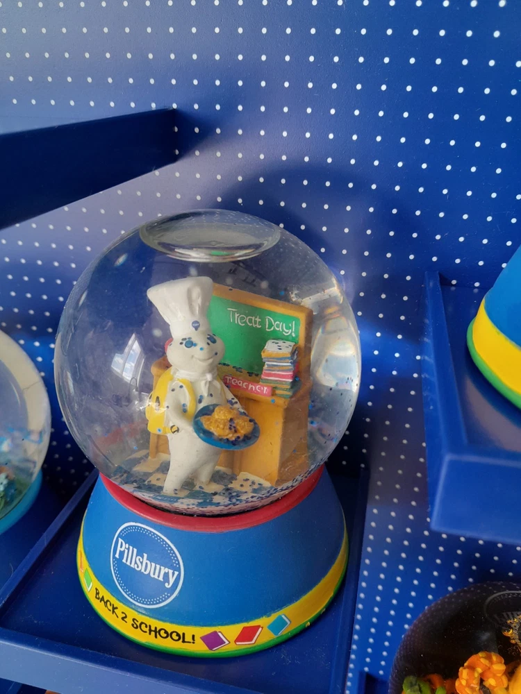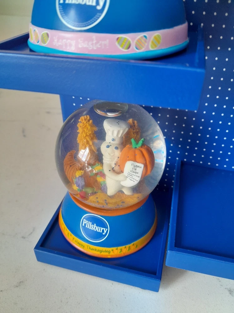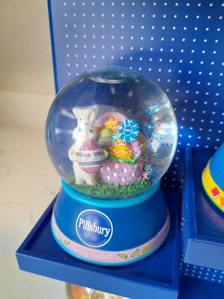 The Rare NOS Willabee & Ward Pillsbury Dough Boy Holiday Snow Globe Display features 7 multicolor snow globes depicting the iconic Pillsbury Dough Boy character in a festive holiday theme. This medium-sized set is complete with a display shelf, making it a perfect addition for adults who are collectors of holiday and seasonal decor. With a discontinued and retired status, this original advertising piece from the 2010-2019 time period is a unique and nostalgic find for fans of the Pillsbury brand. New in Box. Stand or wall hanging