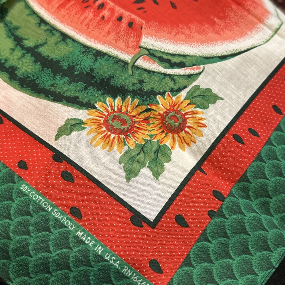 This is a vintage bandana with a watermelon design, made from a poly/cotton blend fabric. It measures 22" x 22" and features a nature character. The bandana can be used as a neck warmer, face mask, and scarf, making it a multifunctional accessory. It is suitable for unisex use and can be worn during any season. The exciting watermelon plant design makes it a unique piece to add to your collection. This bandana is new without tags and was made in the United States. What a great Mother’s Day gift this will make, especially for the mom who enjoys planting and growing watermelon!