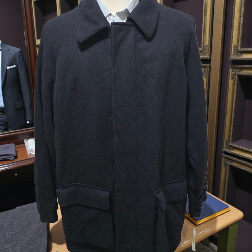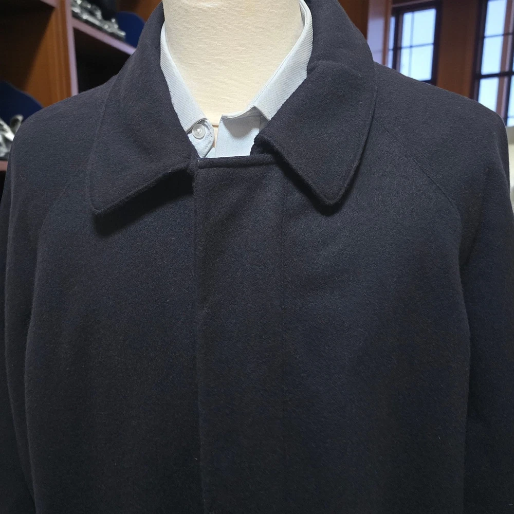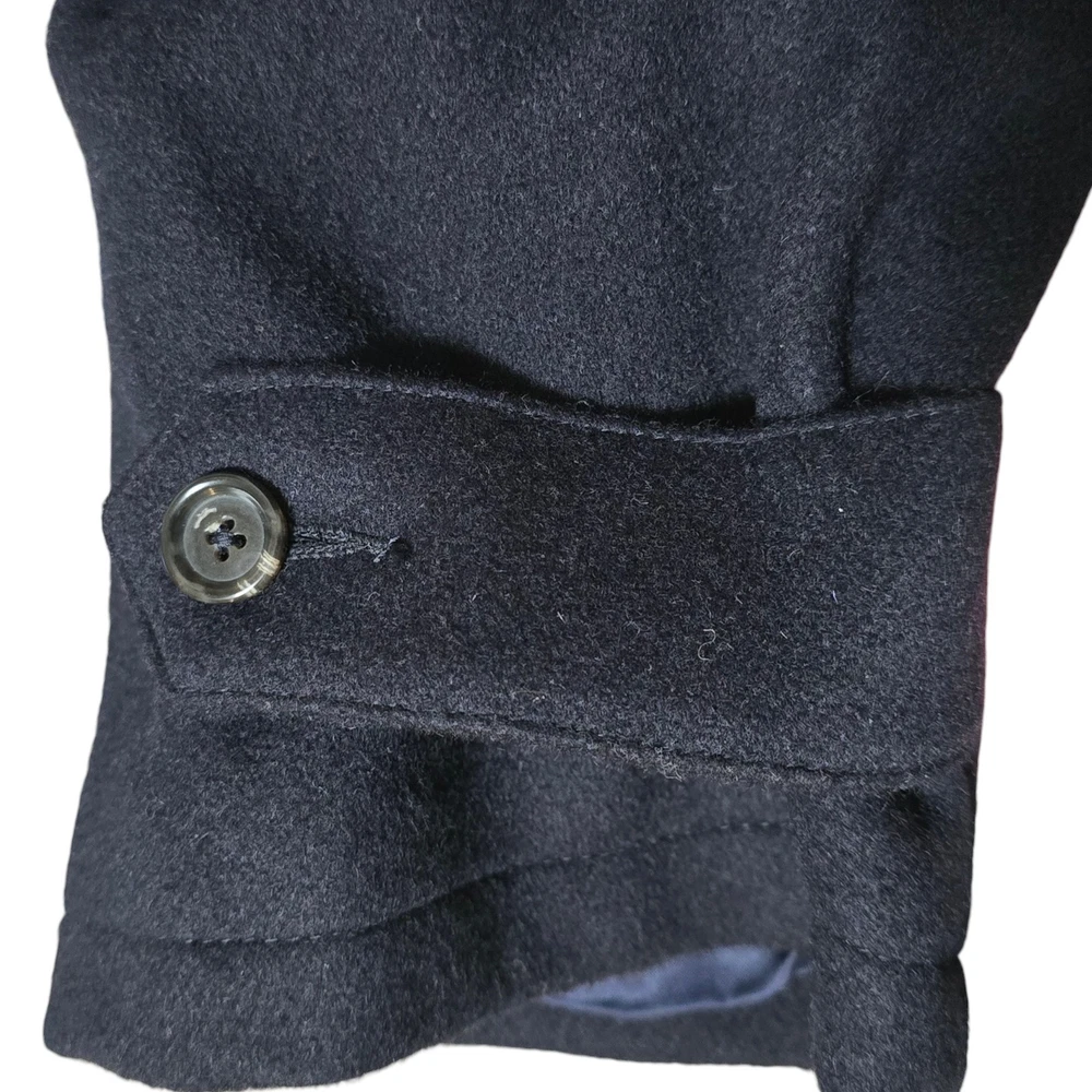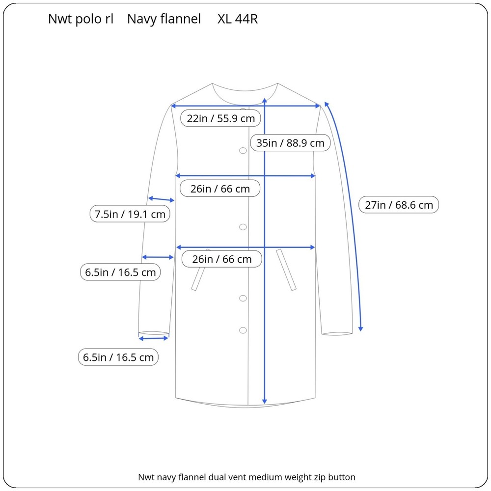 Size: tagged a XL measures as a 44r USA with 27 -inch arm length and a jacket length of 35 inches. For complete measurements, see photo #2 To see exactly how we measured, see the last series of photos. Condition: vintage new with tags. No flaws were found Zip and hidden button front, mediumweight, raglan sleeve, navy flannel, dual vent that can be snapped shut Return policy: We offer free shipping and no returns. We can not afford to offer both in the highest return category on eBay. It becomes very expensive to mail out items for free for people to try on if they are not confident in checking the measurements in picture #2. If you prefer to have the ability to return the item and pay $17.95 shipping, please send us a message, and we can change the listing format to offer returns. The $17.95 shipping cost would break us out even in the case you needed to return the item. You must contact us upfront to make sure the owner of this consigned item is OK with an option to return. We ship the next business day after the payment is made.