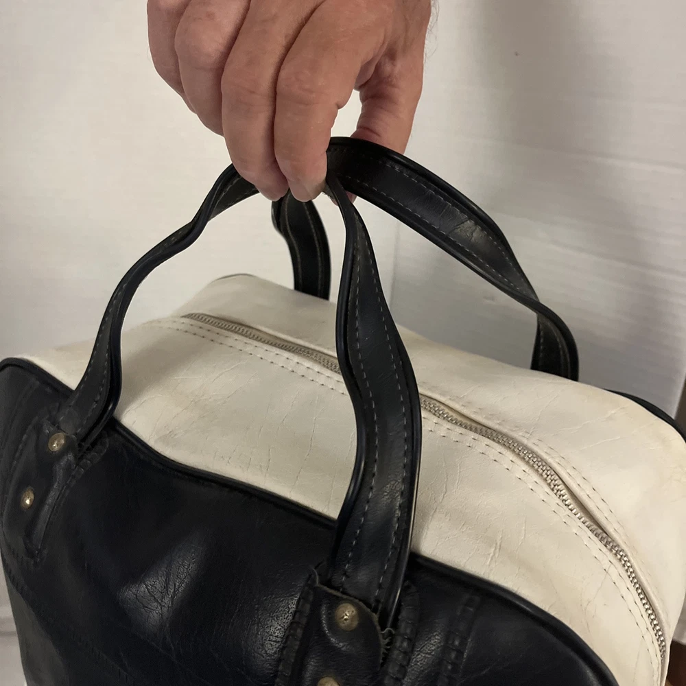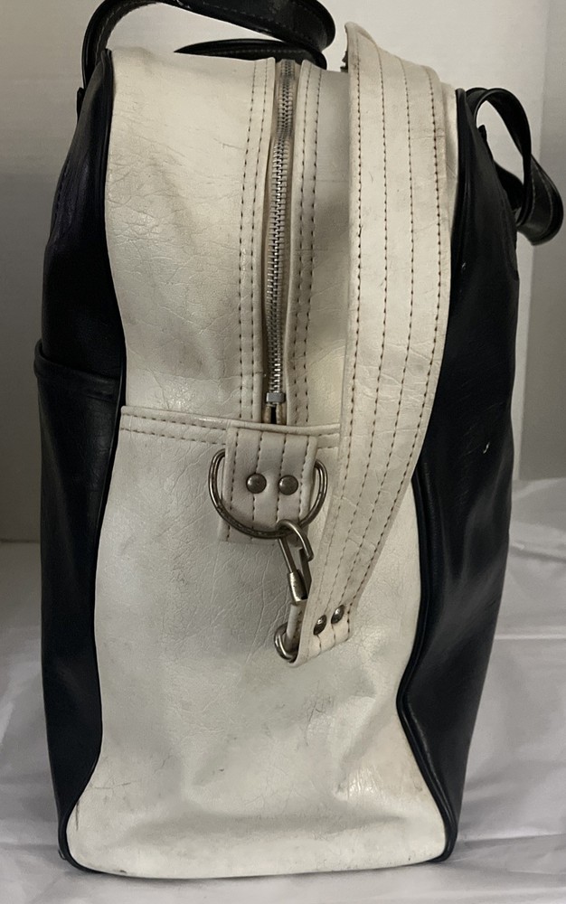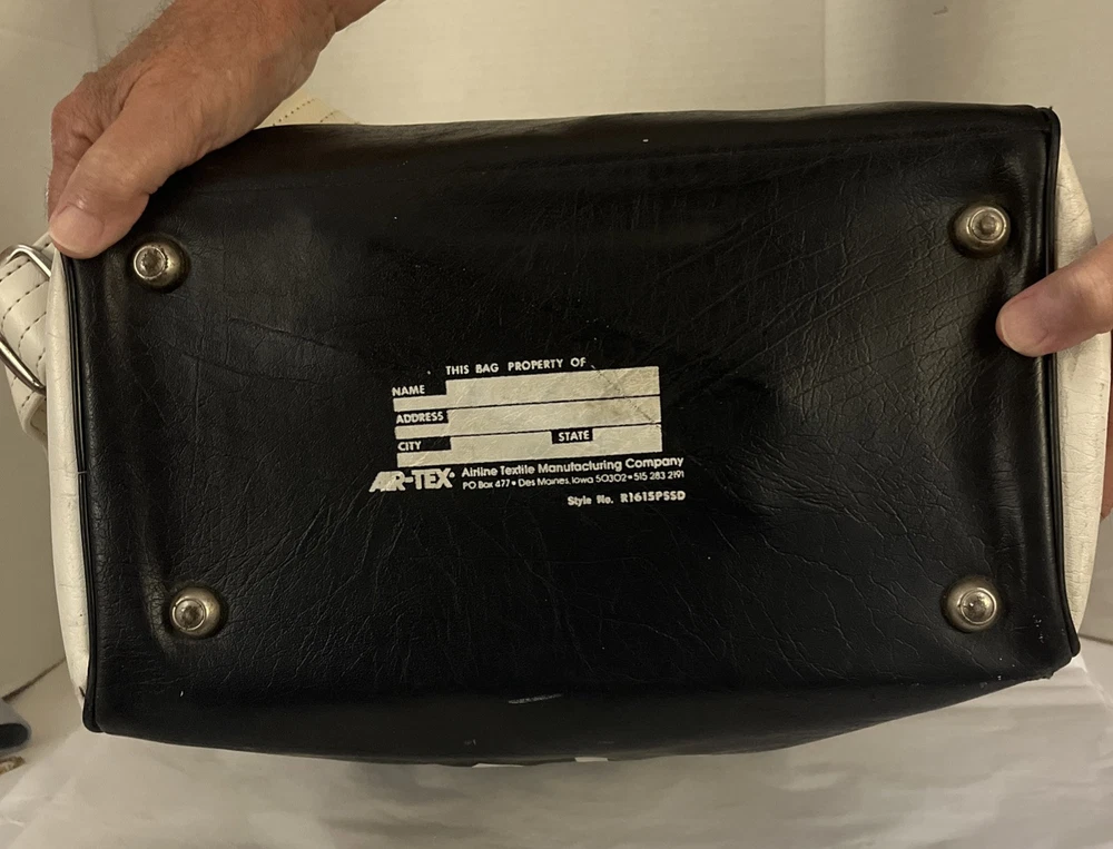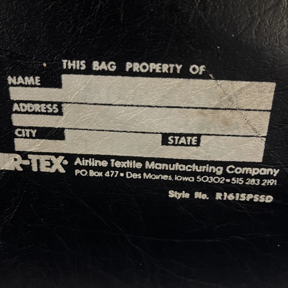 This is a vintage New York large vinyl carry-on bag manufactured by Airline Textile Manufacturing Company. It features a classic design and ample storage space for travel essentials. The bag is durable and ideal for short trips or as a carry-on for flights. There are signs of normal use . With a few scuff marks and a tiny tear that can be seen in the second to last picture.