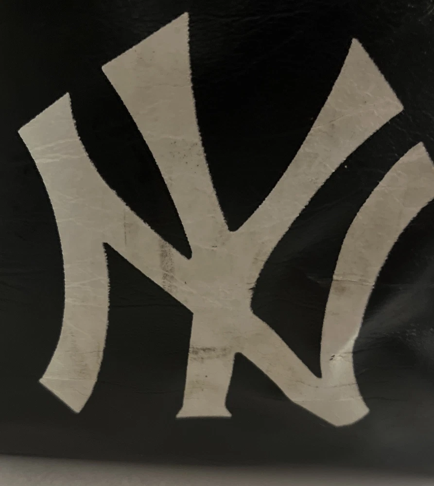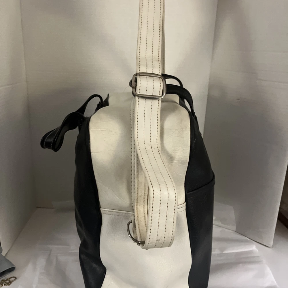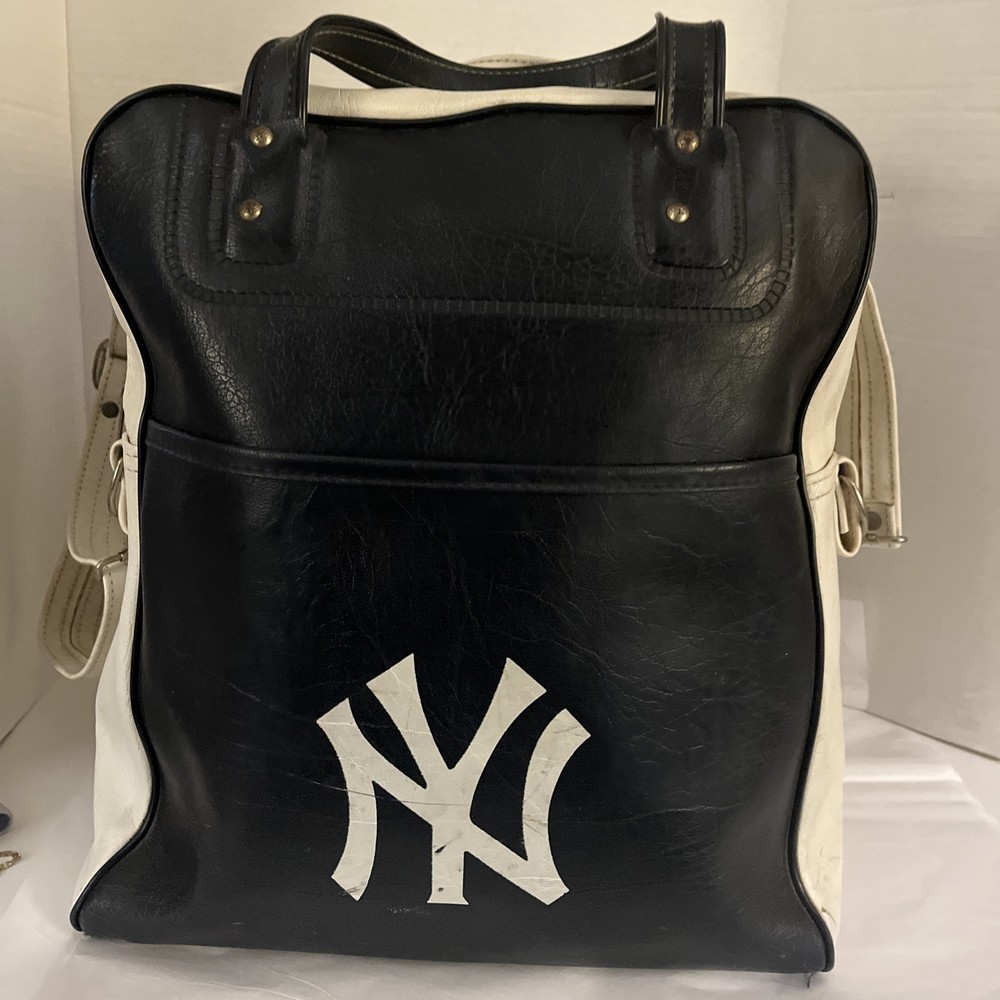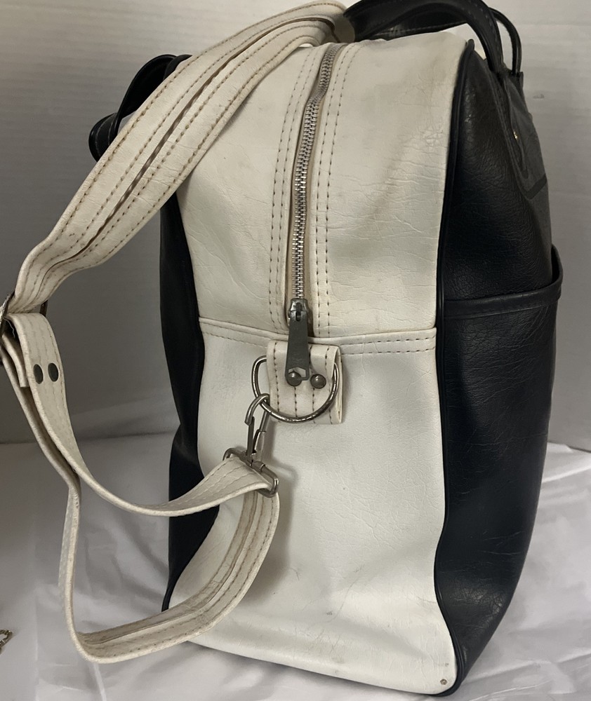 This is a vintage New York large vinyl carry-on bag manufactured by Airline Textile Manufacturing Company. It features a classic design and ample storage space for travel essentials. The bag is durable and ideal for short trips or as a carry-on for flights. There are signs of normal use . With a few scuff marks and a tiny tear that can be seen in the second to last picture.