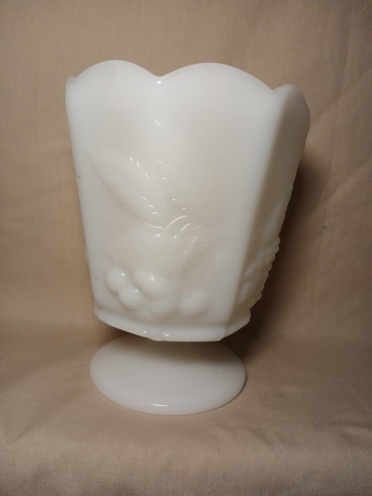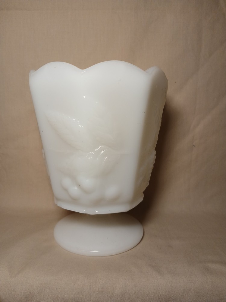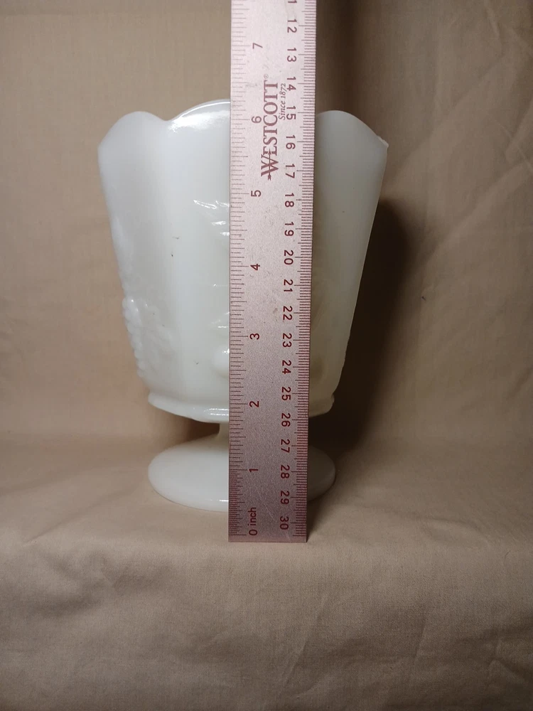 The Vintage Napco Cleveland OH USA 1186 White Milk Glass Vase is a charming collectible piece with a beautifully intricate grape pattern design. Made of high-quality glass in a classic white color, this vase adds a touch of elegance to any space. This piece is a unique addition to any collection, showcasing the craftsmanship and design of the Napco brand from Cleveland, Ohio.