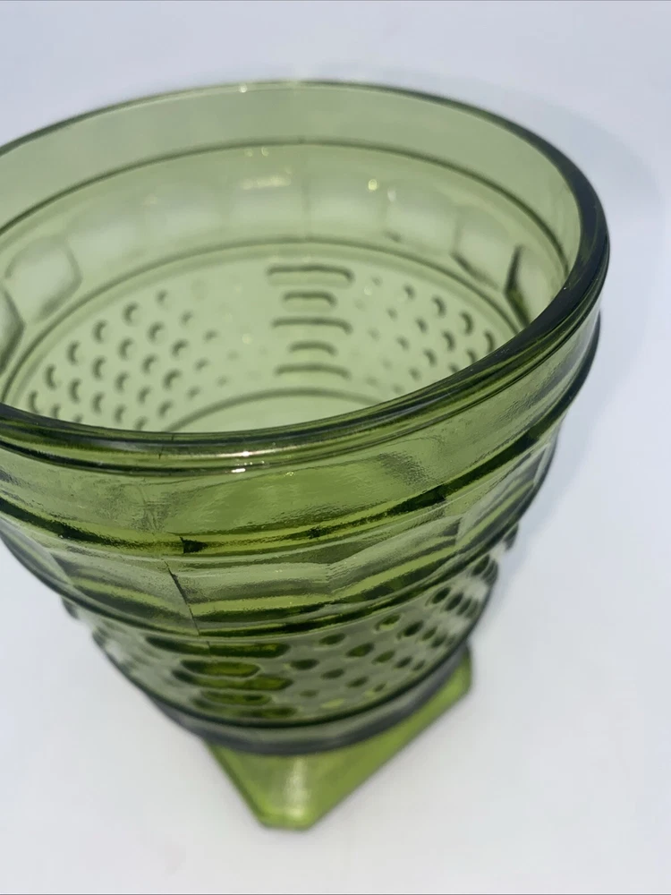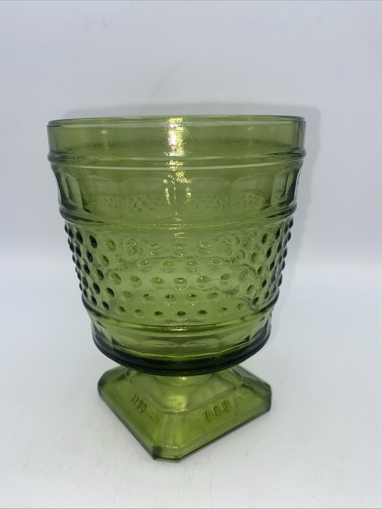 This is a vintage Napco footed planter vase from Ohio, USA. It features a hobnail pattern in green glass, round shape, and stands at 5.5 inches in height. The vase is free-standing, with a width of 4 inches. The model number is 0811, and it is part of the brand Napco. This piece would be a charming addition to any room decor.
