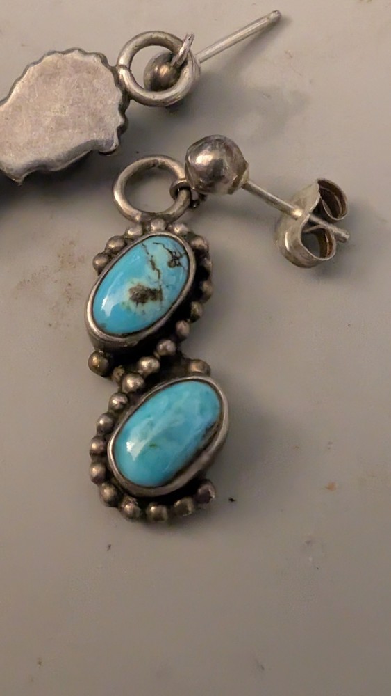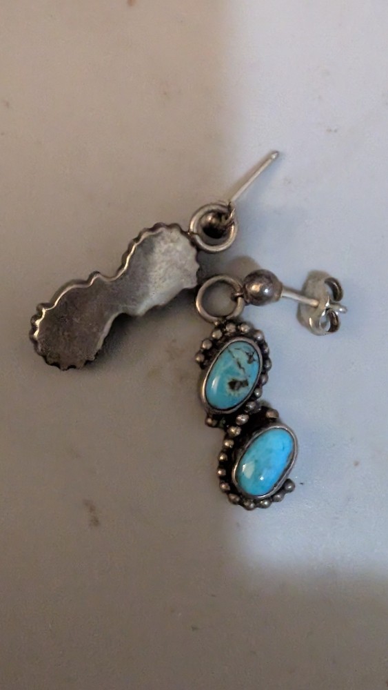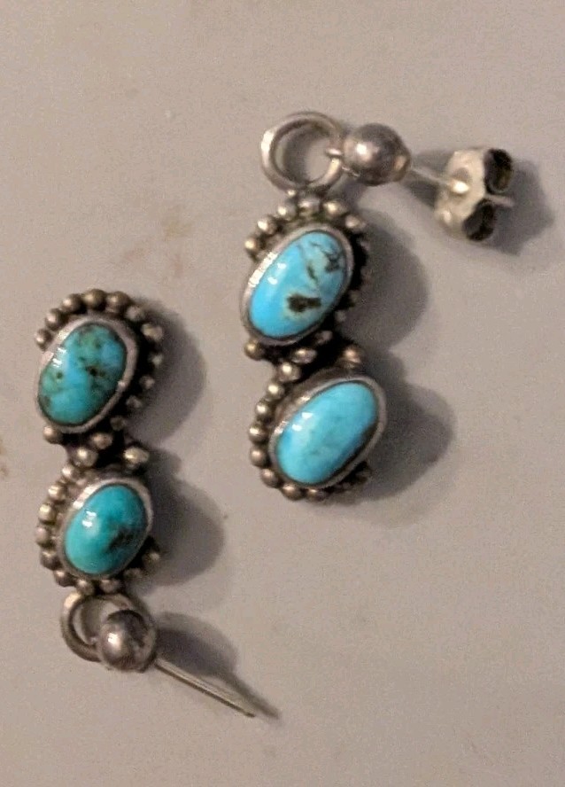 Authenticity: Handcrafted vintage Native American jewelry. Gemstones: Four total turquoise cabochons with vibrant blue hues and light matrixing. Silver Work: Delicate beaded "raindrop" borders and serrated bezels. Closure: Secure post/stud backs (includes silver-tone butterfly clutches). Size: Dainty 1-inch drop, perfect for daily wear. Condition: Pre-owned vintage. The silver has aged beautifully with a dark patina that highlights the turquoise. Note: Lightly cleaned but left in original vintage state for collectors.