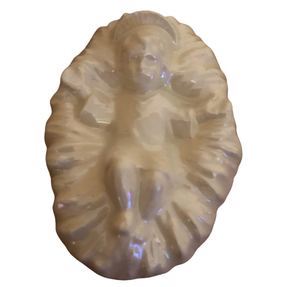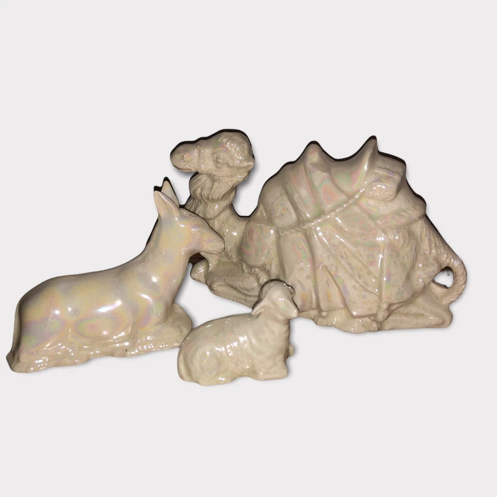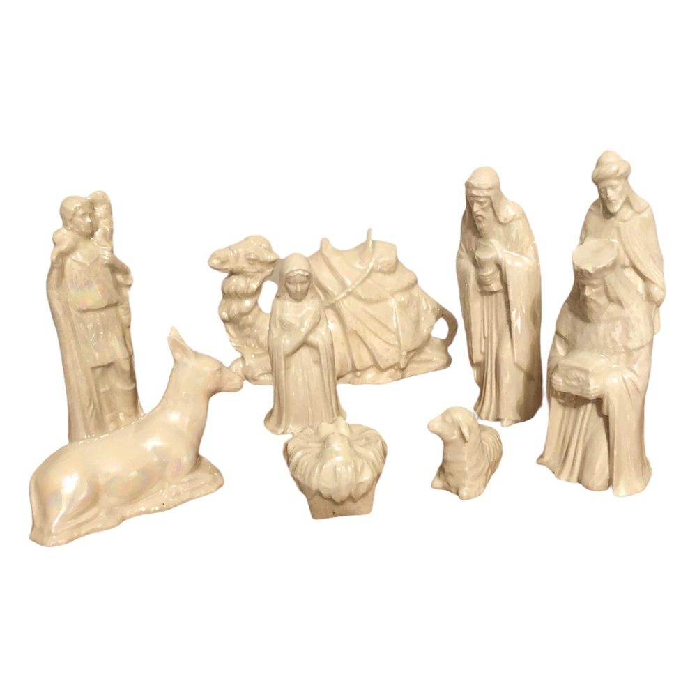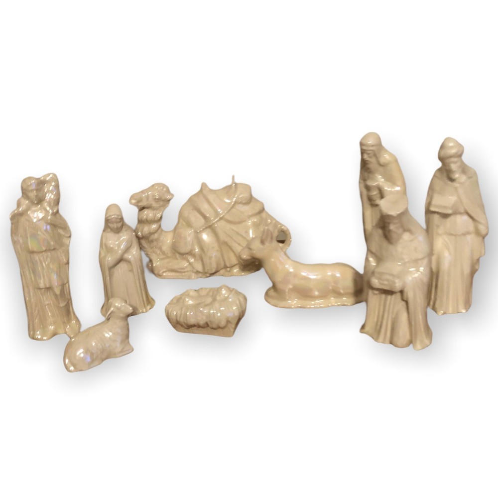 Vintage 9 Piece Ceramic Iridescent Glazed White Mold Nativity Set. Set Includes, Baby Jesus, Mary, Joseph, Three Wisemen, Donkey, Camel, Lamb. Height of Figurines Vary from 2” to 5”. Condition Excellent. No Chips or Cracks. Smoke/Pet Free Environment. 30 day returns. Shipper pays return shipping. Refund issued upon receipt of item/s in condition shipped to buyer.