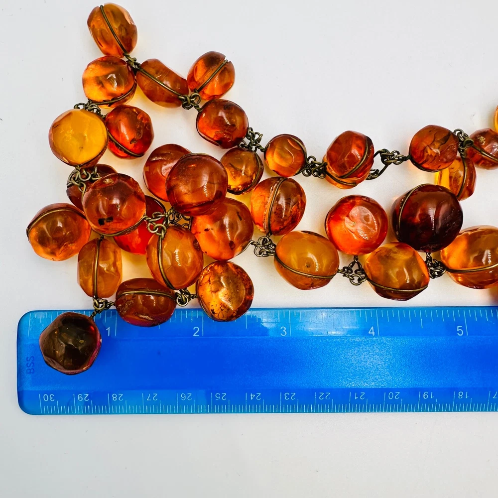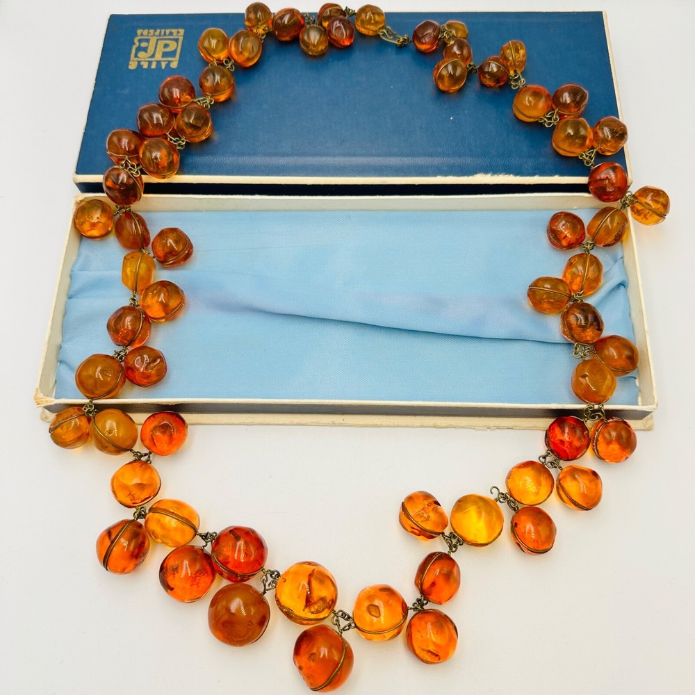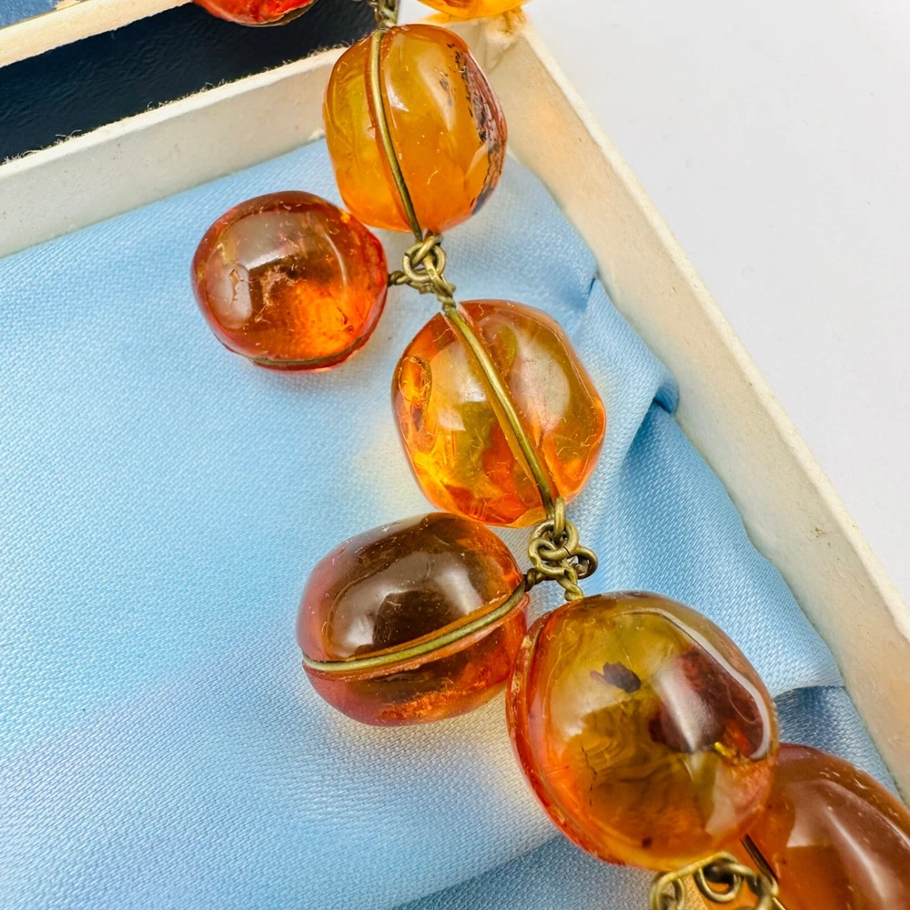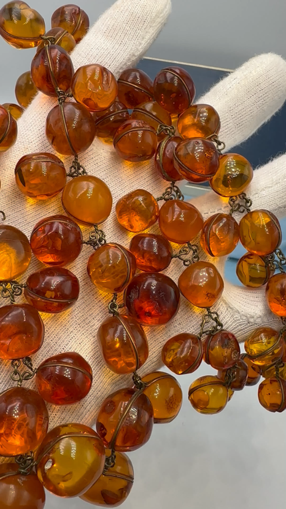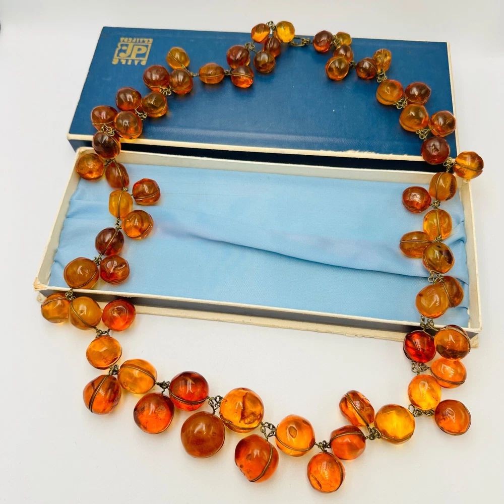 This authentic collectable natural amber beads necklace from the Soviet era is a unique piece of jewelry that will surely catch anyone's attention. The rough-shaped, polished amber beads are strung together to create a stunning 30-inch long necklace that hangs beautifully around the neck. The orange-colored amber beads are natural and have not been enhanced in any way. They are from the Baltic region and were crafted by the Daile Klaipeda Factory in 1960s with original card-box. This rare necklace is a great addition to any jewelry collection and is perfect for those who love vintage pieces. On the surface of the amber beads there are some spots and traces of natural origin, which only confirms the originality and uniqueness of these beads. There are my other items... https://www.ebay.com/usr/universeofjewelry