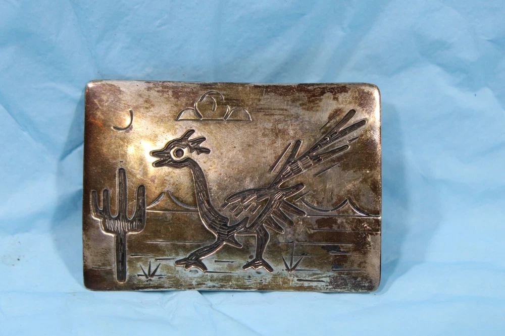 Marked on back Sterling and T A Begay. 2.5 by 1.75 inches. Front features typical Arizona theme with Roadrunner and Saguaro cactus. Not polished, untouched as found. No dents.