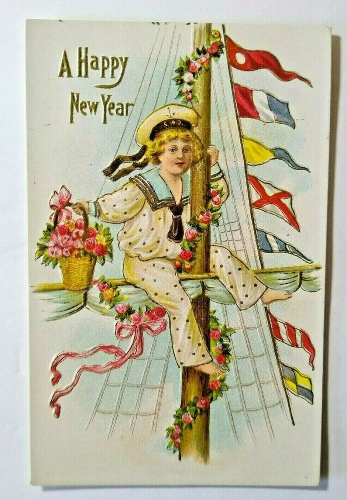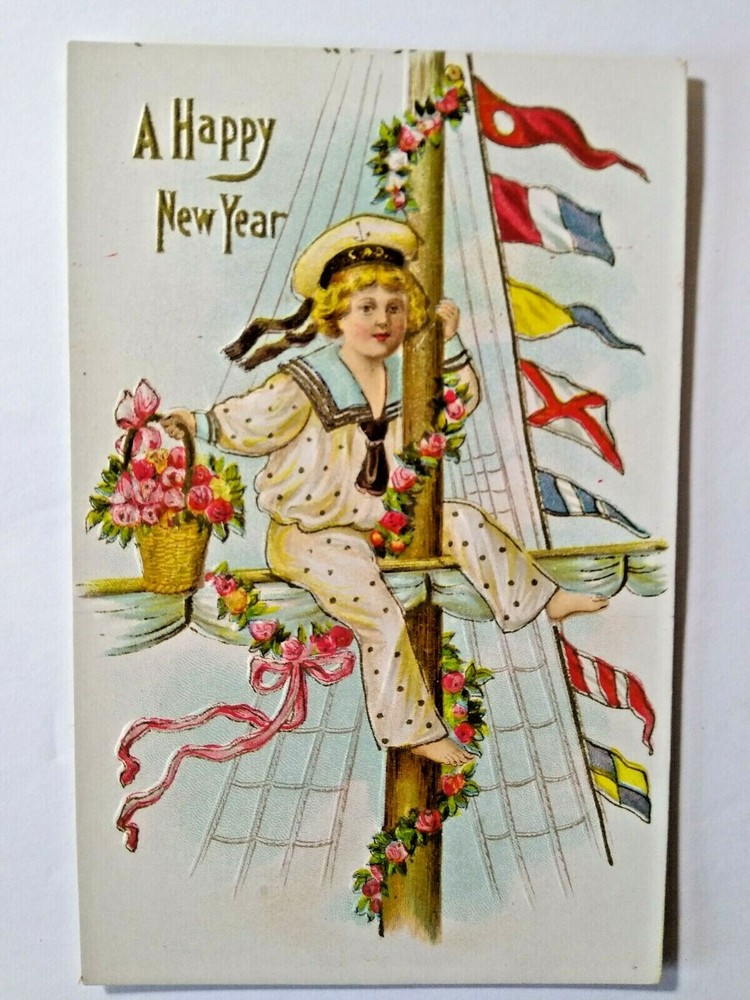 New Years Postcard Navy Sailor Boy CAD Hat Cap Embossed Flags Antique Unused Antique vintage original non posted embossed New Years postcard. Has light corner wear. Stock#ny26. Additional vintage Halloween, Santa, Christmas, holiday postcards, are in our store. SHIPPING Bundle and save by using cart and making single payment. International buyers are responsible for any import fees/taxes. ABOUT US Seller of vintage ephemera, collectibles, retro gifts, advertising, artwork, vinyl records, pinball and arcade game flyers and parts, Mad magazines, antique Halloween & holiday postcards, Christmas items, super hero memorabilia, horror themed art, fun stuff. Bundle and save by using the cart.