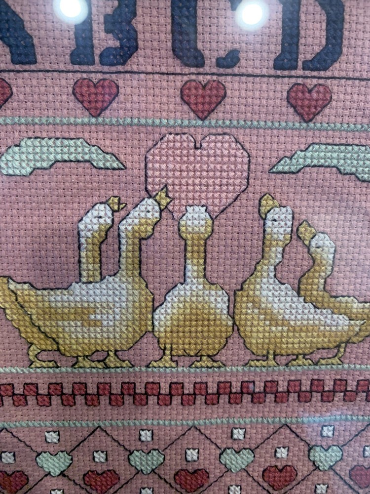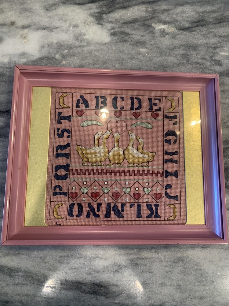 Vintage Needlepoint Alphabet Art with Geese and Hearts 9x11 Wall Decor