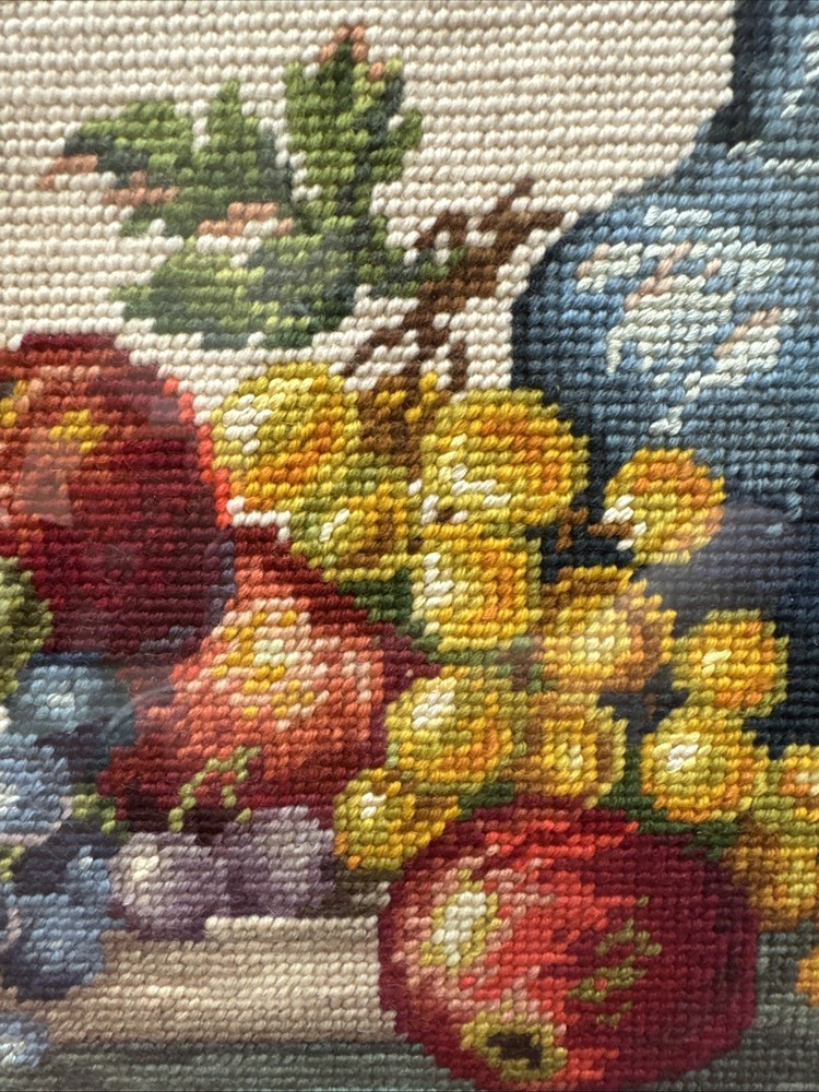 The product is a vintage needlepoint canvas featuring a fruit kitchen design. Measuring 19” x 15”, this rectangular canvas is perfect for hand embroidery and cross-stitch projects. The multi-color design adds a unique touch to any crafting or embroidery project.