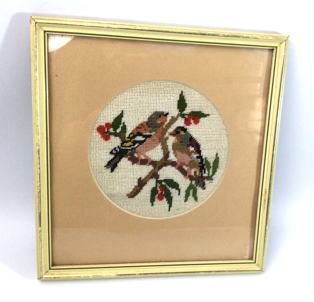 Vintage Needlepoint Picture Framed Birds on Branch with Cherries 7 Inch