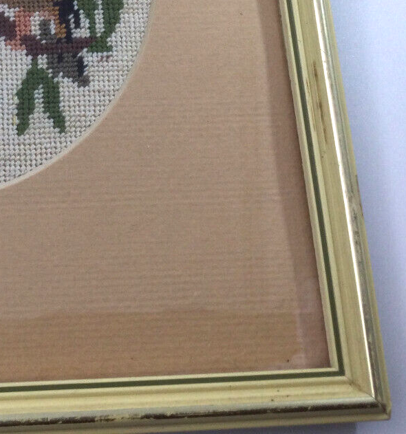 Needlepoint Picture Vintage Birds on Branch Cherries Framed 7" x 7.5". Matte is square with round picture 4" opening. back side paper is damage, photo 4. Sticker is shoving that it was framed in One of the German speaking countries. Very good condition of needlepoint picture. Frame has some gold paint missing, photo 5. Back side paper is damage. InvN/GS/3