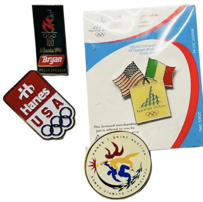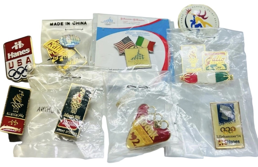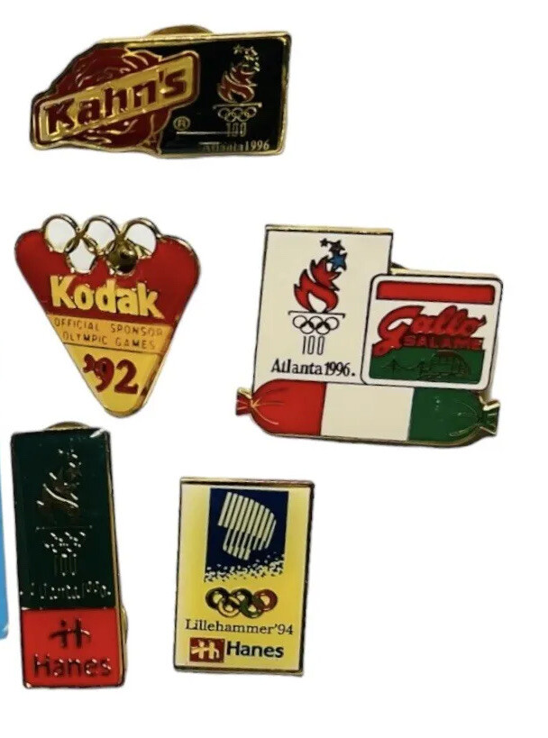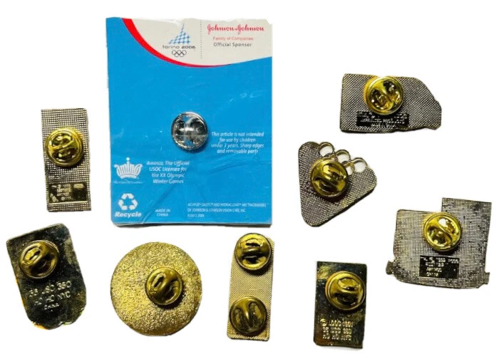 Lot Of 9 Olympic Sponsor Hat Or Lapel Pins Assorted Years Some Vtg Some New Good Some are new and still in the plastic package, some are missing the packaging (I took those in the packaging out to take photos, with the exception of the J & J), so I listed them all as being preowned, though some are not and the others may not be either. As you can see in the photos, there are several different sponsors, some of the pins are from the same sponsors but different styles and from different years and others are single pins from a single sponsor. The dates vary from 1992, 1994, 1996, 2006. Measurements are aprox 1” to 1 1/4”