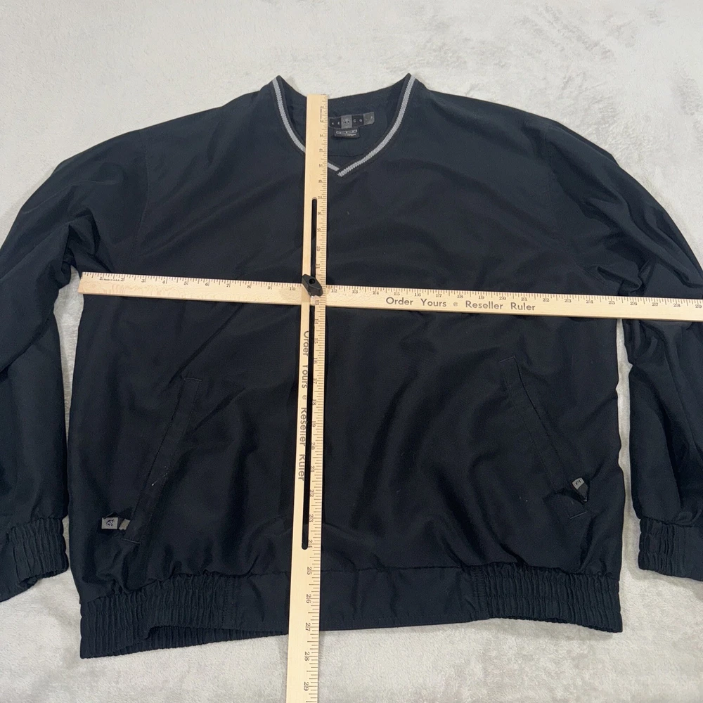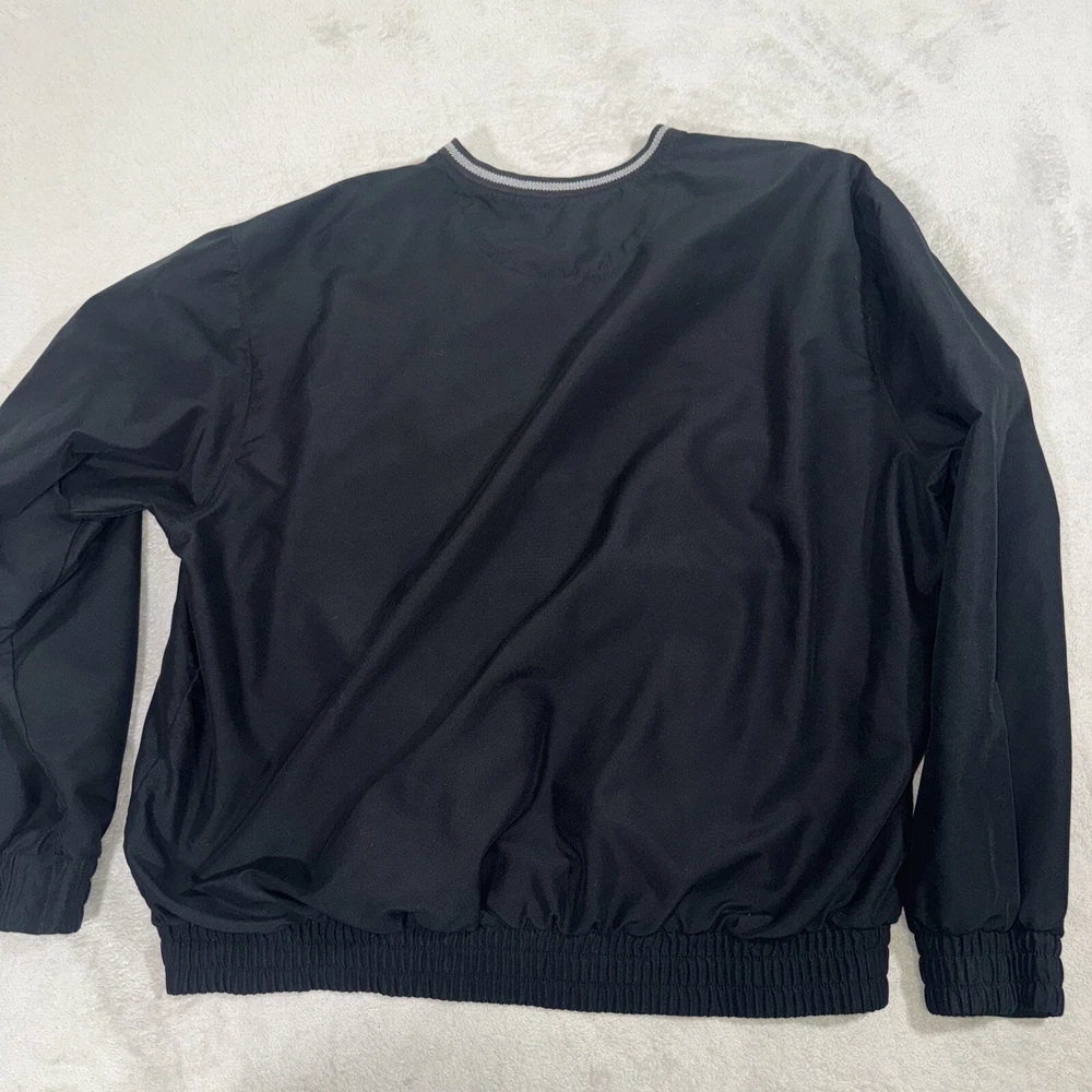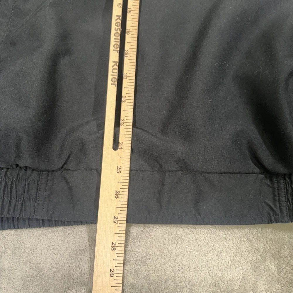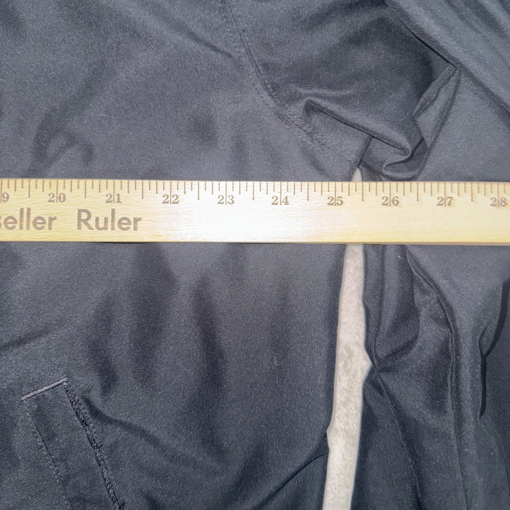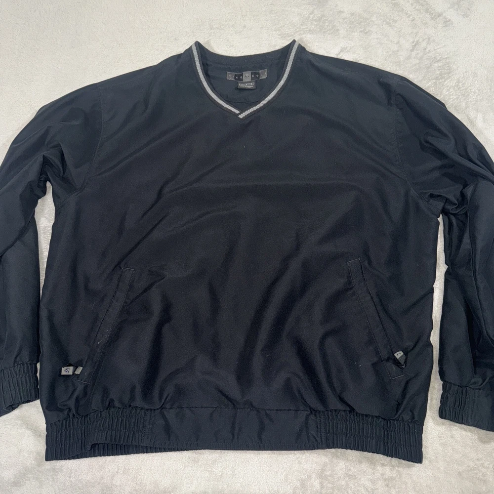 This vintage Nike jacket is a must-have for any athletic man. The black windbreaker has a short length and is made of microfiber polyester with an embroidered swoosh. The jacket is lined with polyester and has a solid pattern. The jacket is in great shape and is perfect for outdoor activities such as golf. It is a size L and fits regular size men.