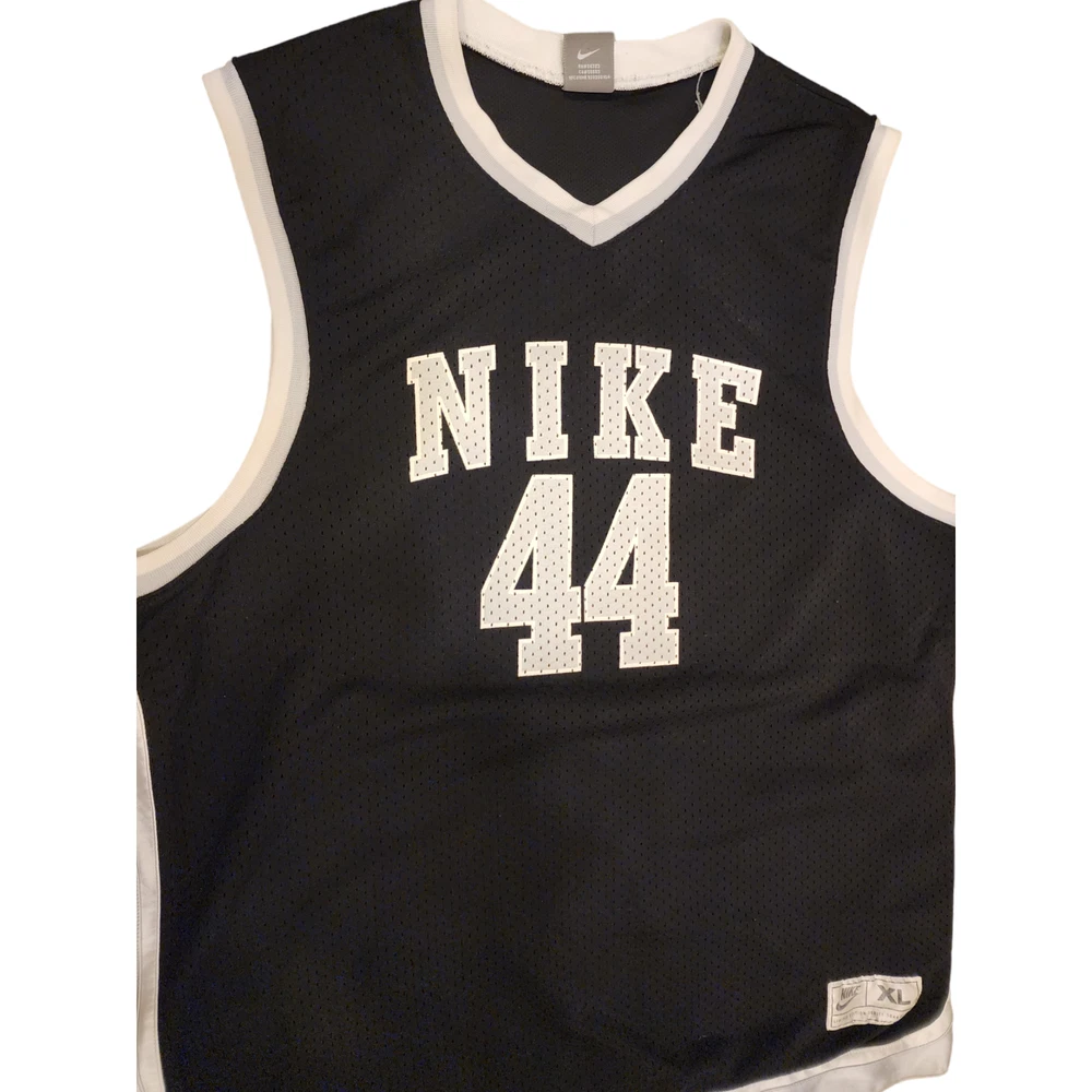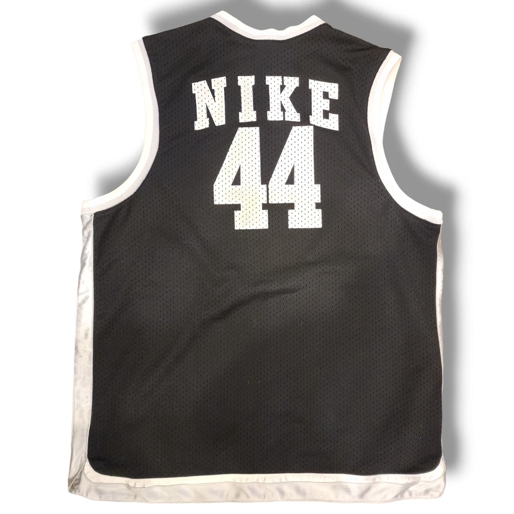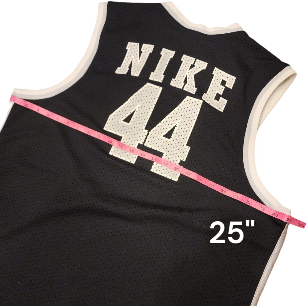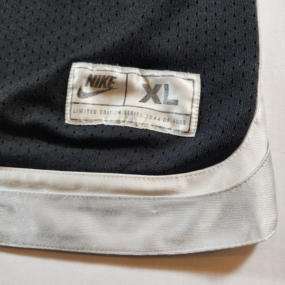 This is a black Nike basketball jersey with a white "NIKE" and "44" on the front. The jersey has a white v-neck collar and white trim around the arm holes and bottom hem. The jersey is size XL. The jersey is made of mesh material. It is a vintage style jersey and would be perfect for a basketball fan who wants to add a unique piece to their wardrobe. Condition: Great preowned condition As part of a limited run (3044 of 4000), its a rare find for collectors and fans alike. Please see the pictures for exact measurements and further details.