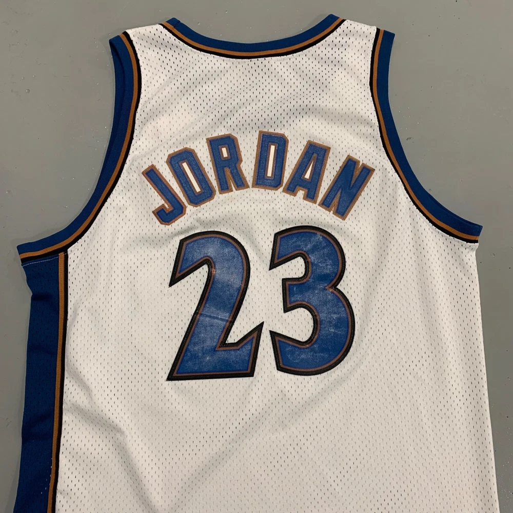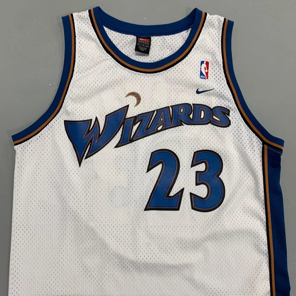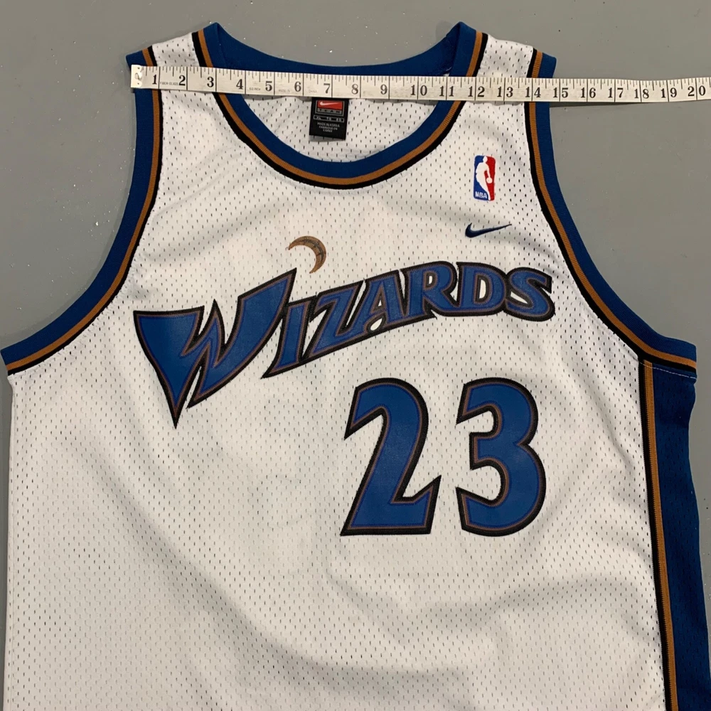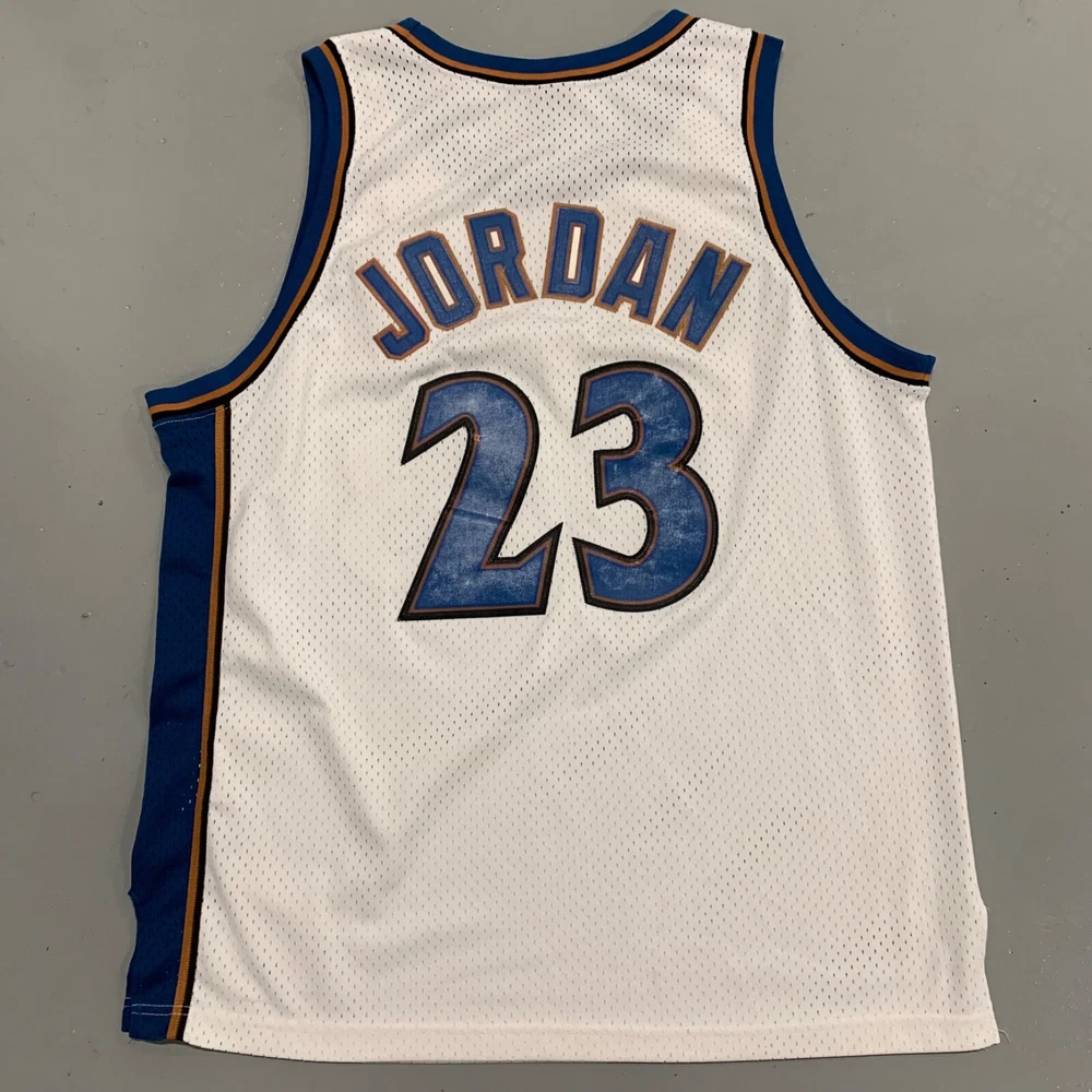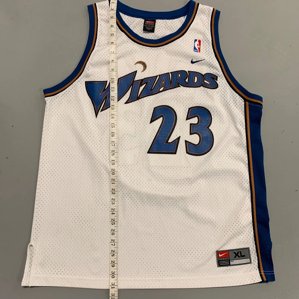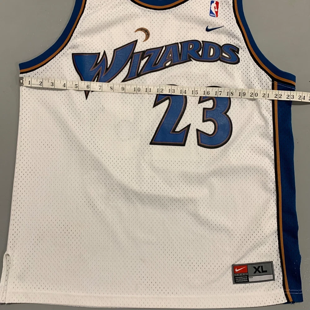 Expect Signs of Age and Wear Vintage 2000s Nike NBA Washington Wizards Michael Jordan #23 Basketball Jersey White / Dark Blue / Bronze Embroidered Logos, Stitched Name and Number Men's Size XL Pit to Pit 23 1/2" Shoulders Across 15" Shoulder to Hem 31 1/2"