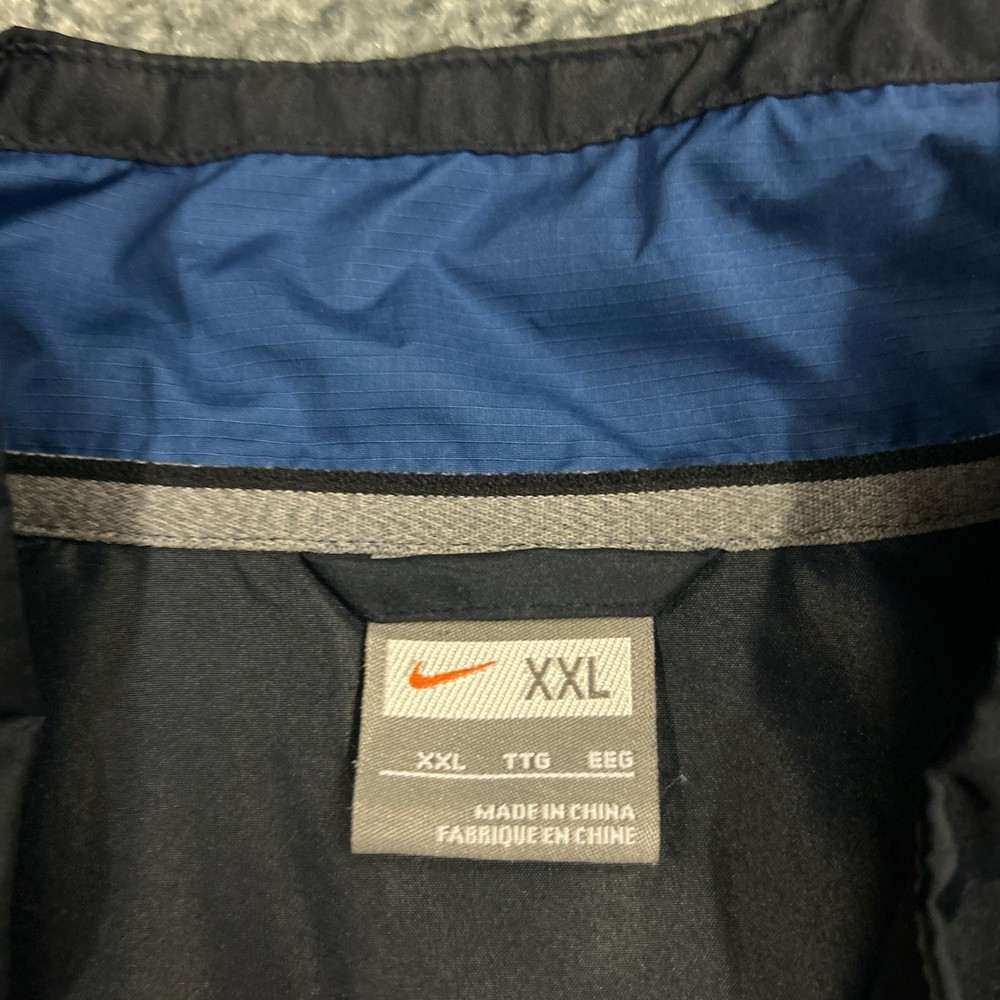 This product is a vintage Nike navy blue striped tracksuit windbreaker jacket in men's XXL size. Made of nylon, the jacket features a classic windbreaker style with a striped pattern. Perfect for casual wear and adding a sporty touch to your outfit, this retro Nike jacket is a stylish and unique addition to any man's wardrobe.