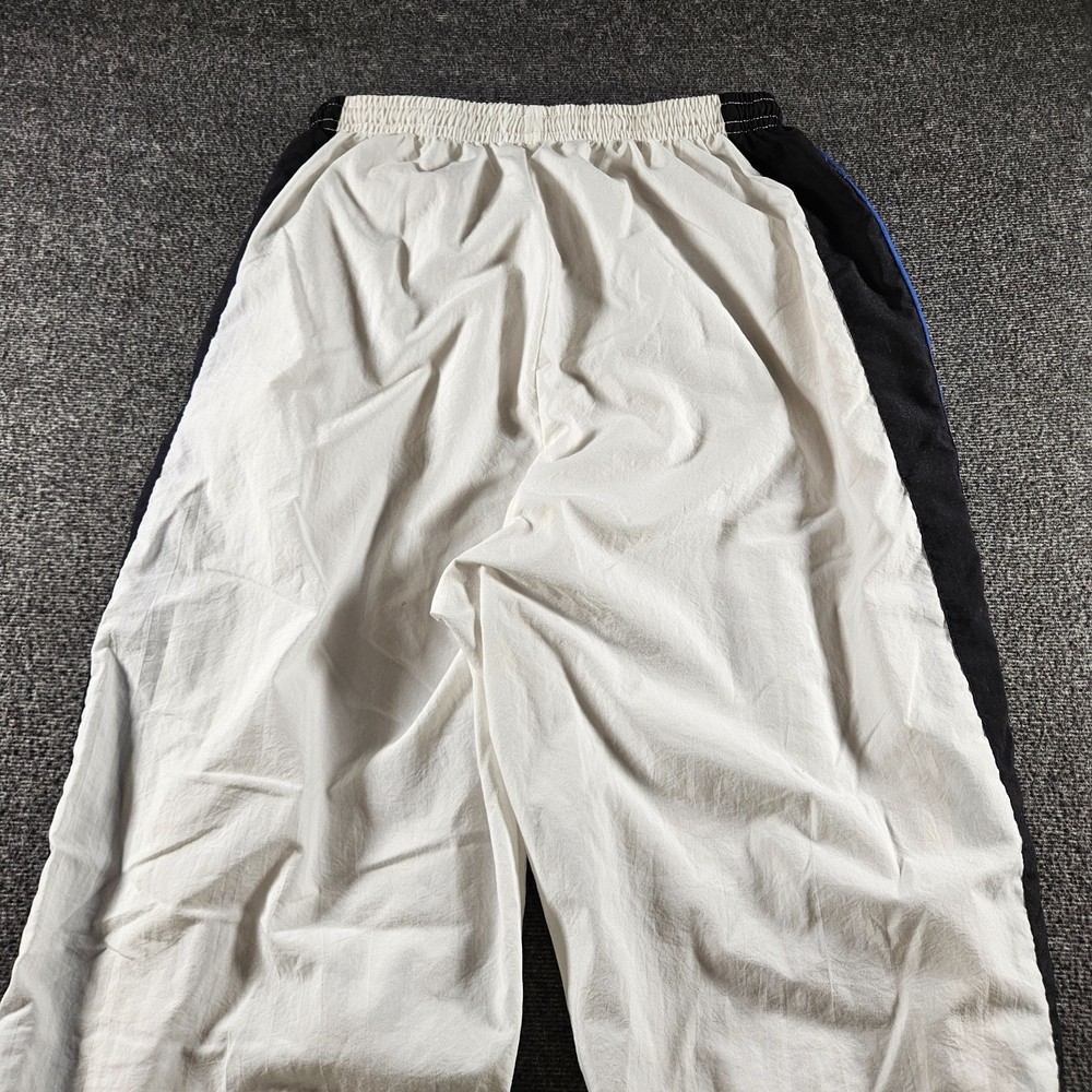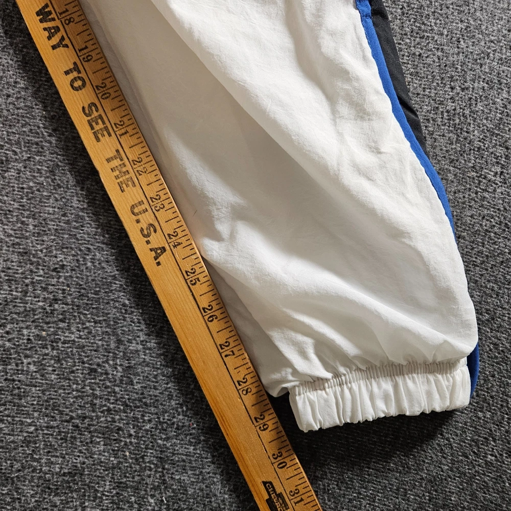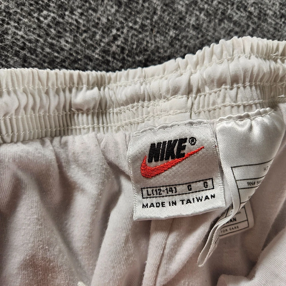 These Vintage Nike Track Pants in white and blue are a nostalgic throwback to the 90s, perfect for a youth size large boy looking for a statement piece of activewear. Made of nylon material, these pants feature an elastic waist for comfort and are machine washable for easy care. The solid pattern and Nike branding add a touch of retro style to the wardrobe, ideal for the winter, fall, or spring seasons. Made in Taiwan, these track pants are a unique and stylish addition to any young boy's clothing collection.