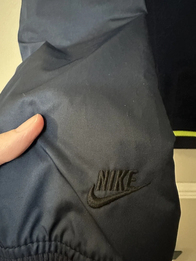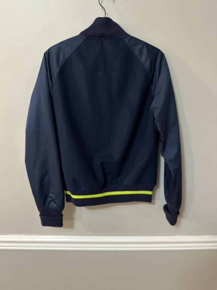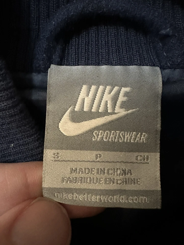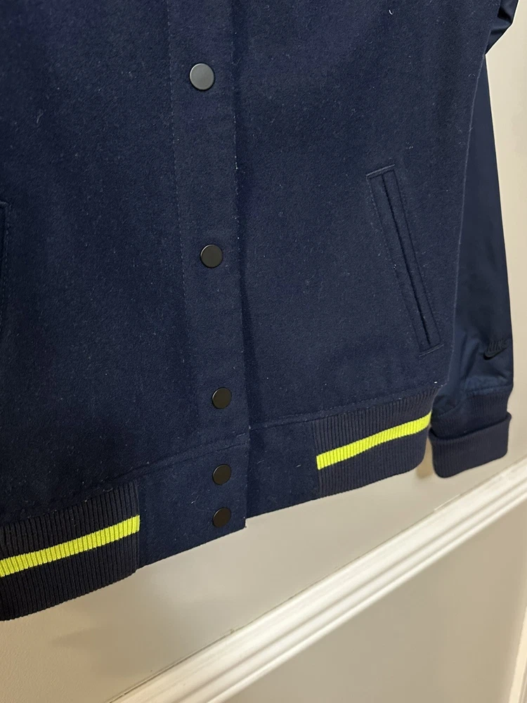 Crafted for the stylish and active woman, the Vintage Nike Varsity Bomber Jacket blends classic aesthetics with modern comfort. This navy wool jacket, accented with a vibrant neon stripe, is a quintessential piece for an athletic fit that doesn’t compromise on style. The timeless varsity design, complete with embroidered Nike logo and snap closure, makes it a versatile addition to any wardrobe. Whether you're out for a casual stroll or on the move during travel, this jacket is tailored for all seasons and occasions. Designed with practicality in mind, it features a soft polyester insulation and convenient pockets. The long sleeves and short jacket/coat length provide a comfortable silhouette, making it an ideal choice for anyone who values a blend of retro vibe and contemporary fashion.