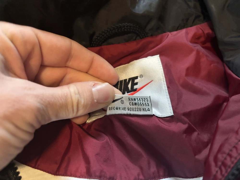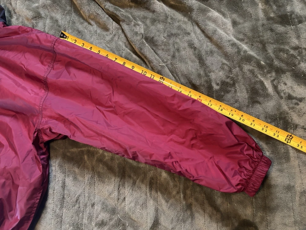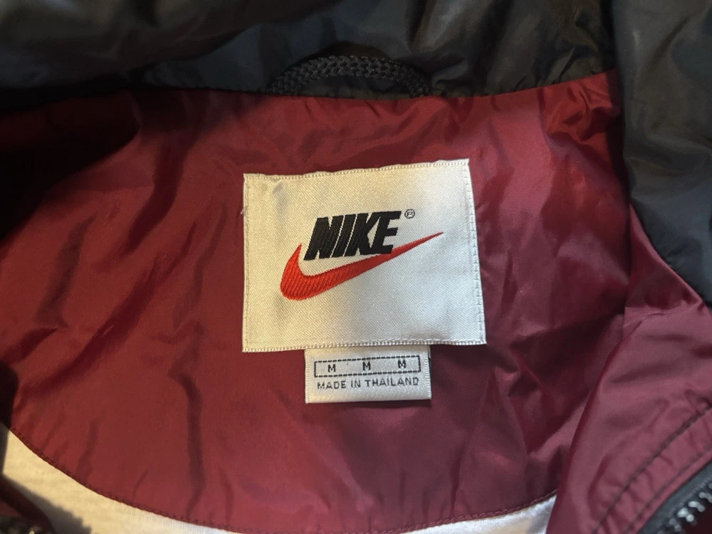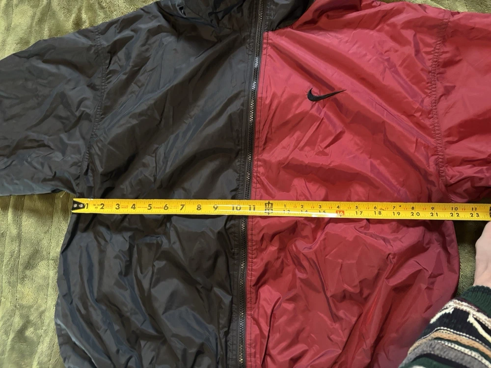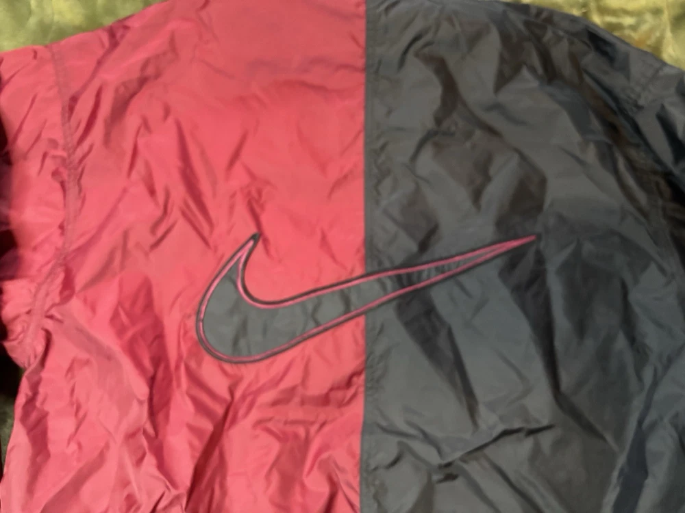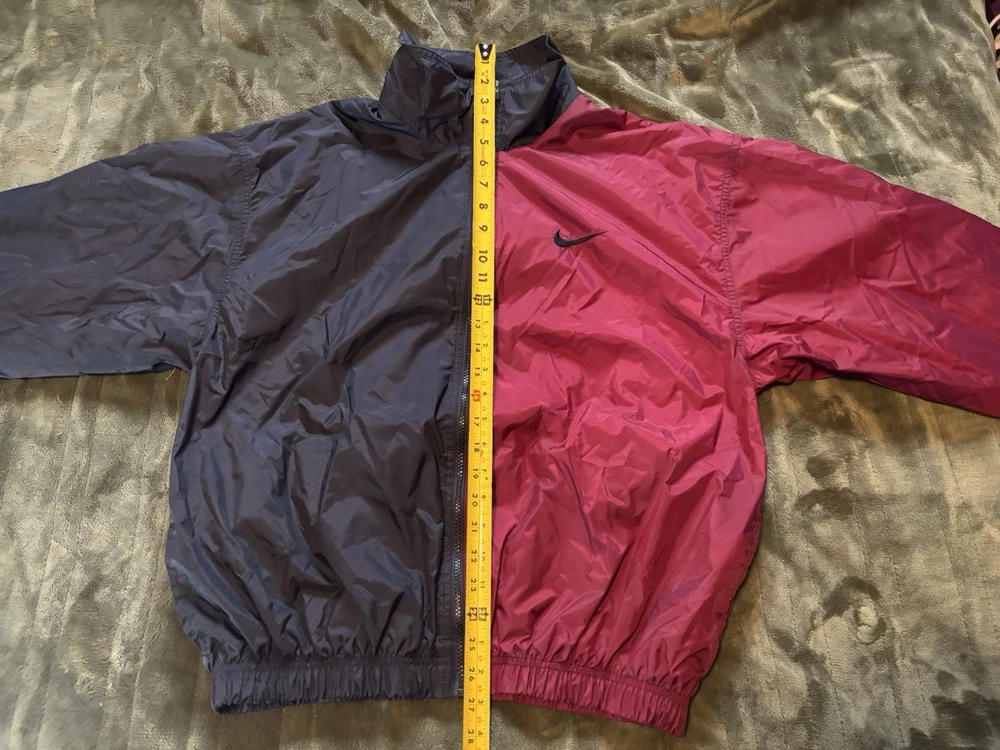 The Vintage Nike Windbreaker Jacket is a stylish and lightweight garment perfect for a variety of occasions. Made of durable nylon with a comfortable polyester lining, this jacket features a stand-up collar, full zip closure, and colorful red and black colorblock design with the iconic Nike Swoosh logo. Ideal for fall, winter, and spring, this mid-length windbreaker is a great addition to any casual or sporty outfit. Easy to care for with machine washable fabric, this jacket combines retro style with modern functionality for a versatile and timeless piece. The zipper fully works but half of the pulltab has been broken off.