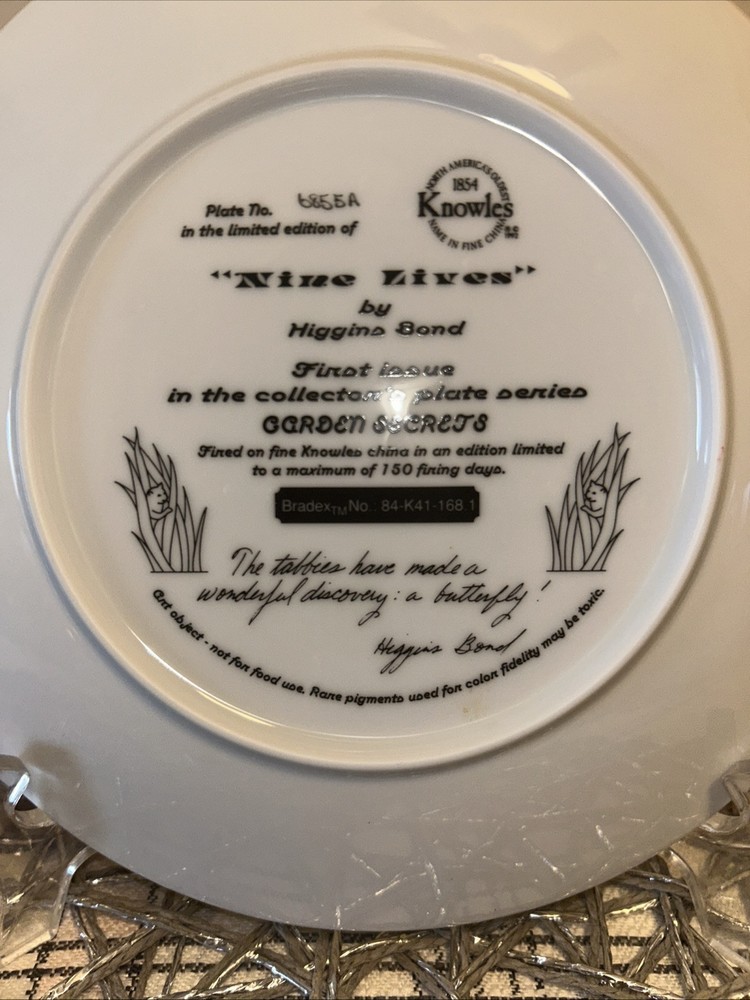 This decorative collector plate is the first issue in the "Nine Lives" series by artist Higgins Bond, featuring a floral pattern and round shape in a multicolor design. Made of bone china with a vintage style, this handcrafted plate showcases a theme of cats and is produced in the art pottery style in the United States. Weighing 12 oz and measuring 8.5 inches in diameter, this Bradford Exchange brand plate is a unique and collectible piece for all occasions.
