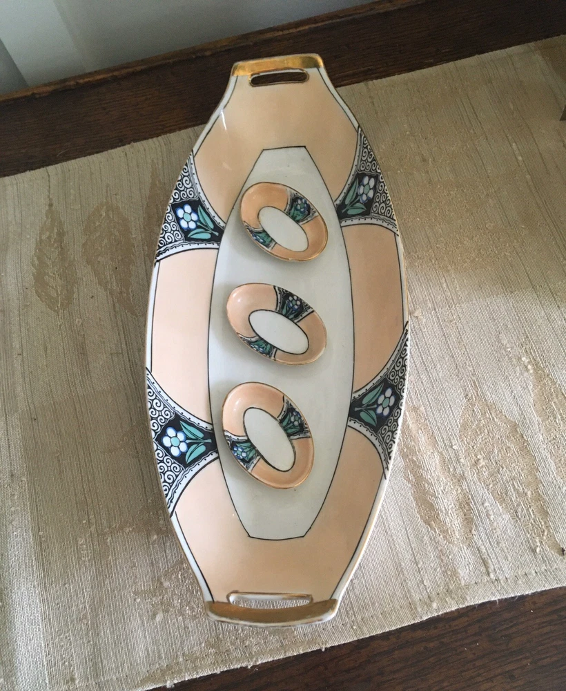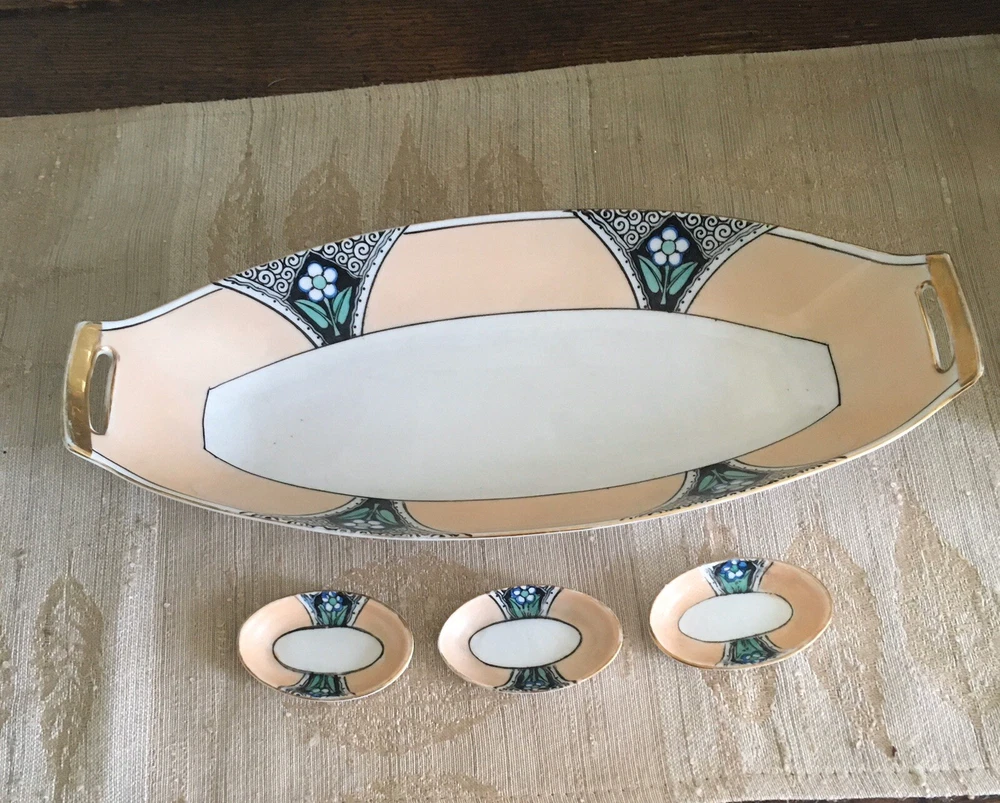 Vintage Noritake Morimura Japan Celery/Relish Dish & 3 Salt Cellars Art Nouveau. Beautifully Retro & Hand painted in pale peach, black & teal on white porcelain. Gold trim. Celery Dish is 12” long, 5 1/8” wide. Salt cellars 2 3/8” long, 1” wide. Preowned/Condition is Used. Please use zoom to see detail & condition. Estate find. Not perfect with some age related wear (one salt cellar has a chip on the bottom rim). Very lovely overall. Shipping in Continental US only. Shipping USPS Ground Advantage.