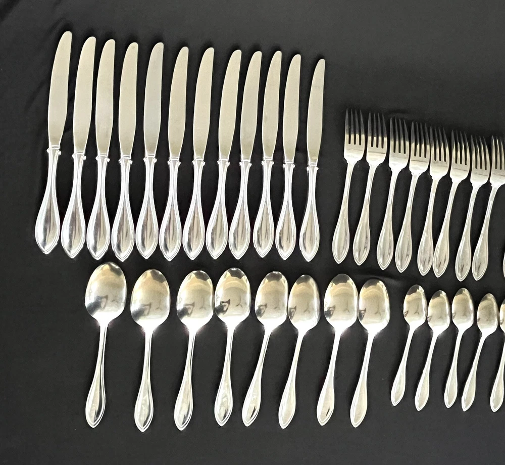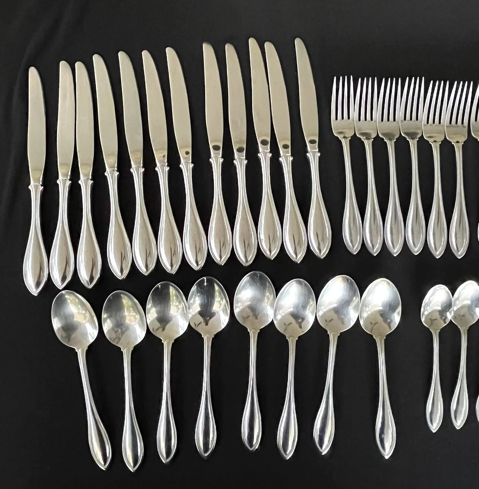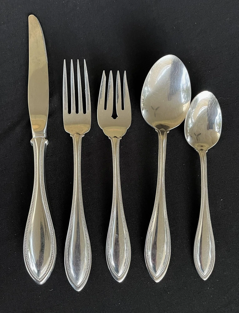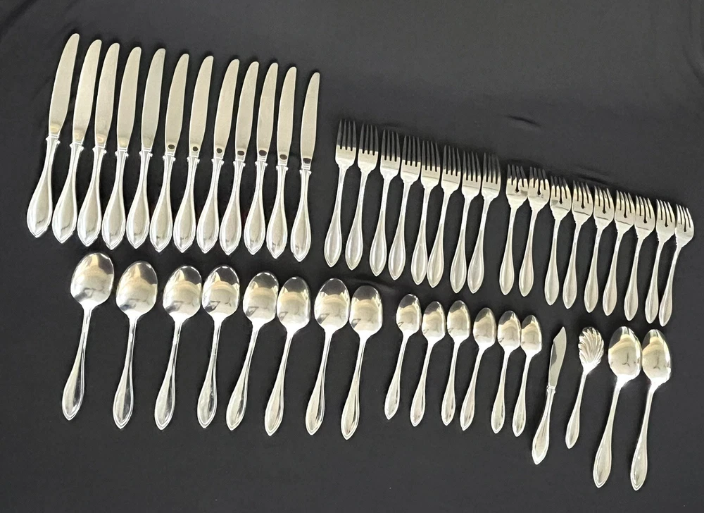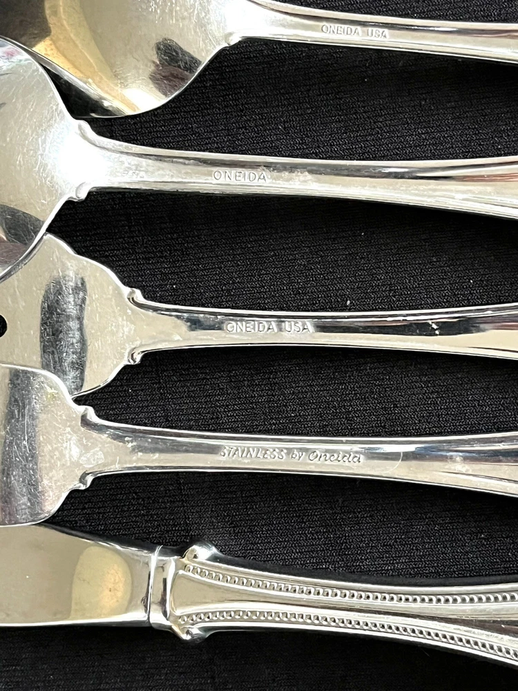 This listing is for 47 pieces Oneida "ARbor-American Harmony" design stainless steel flatware lot. These are in contemporary style with beaded glossy design and made in the U.S.A. in the 1990's. Markings are "STAINLESS BY ONEIDA ", "ONEIDA USA" or "ONEIDA" on the back side, knives have no marking. • Dinner Knife - 12 • Dinner Fork - 8 • Salad Fork - 9 • Table Spoon - 8 • Tea Spoon - 6 • Sugar/Jam Scallop Spoon - 1 • Butter Knife - 1 • Serving Spoon - 1 Total: 47 pieces The weight for this lot is 5 lbs 8 oz. These are in silver-tone stainless steel flatware. Any color or gold tone is just light reflection. These are previously owned condition as shown. A $1 bill is placed for size reference and not included. I do not wish to take return, so please review photos and ask all the necessary questions before purchasing this item. * * * Non-smoking environment! * * *