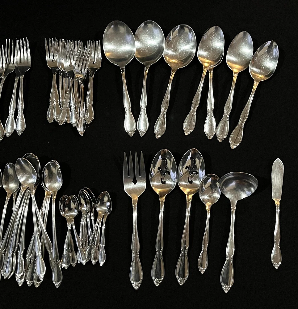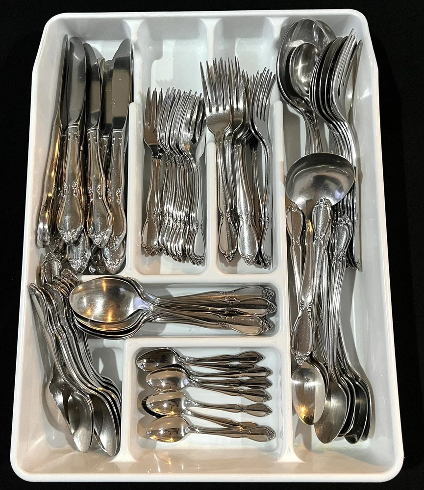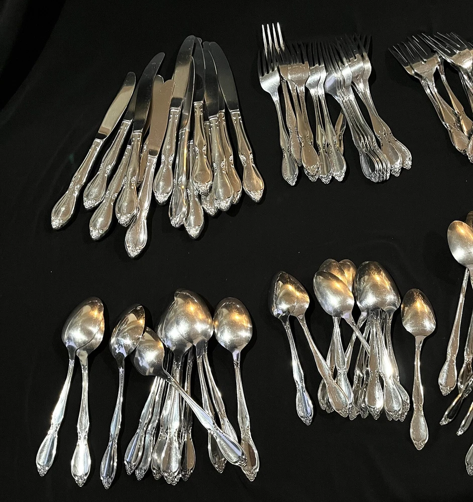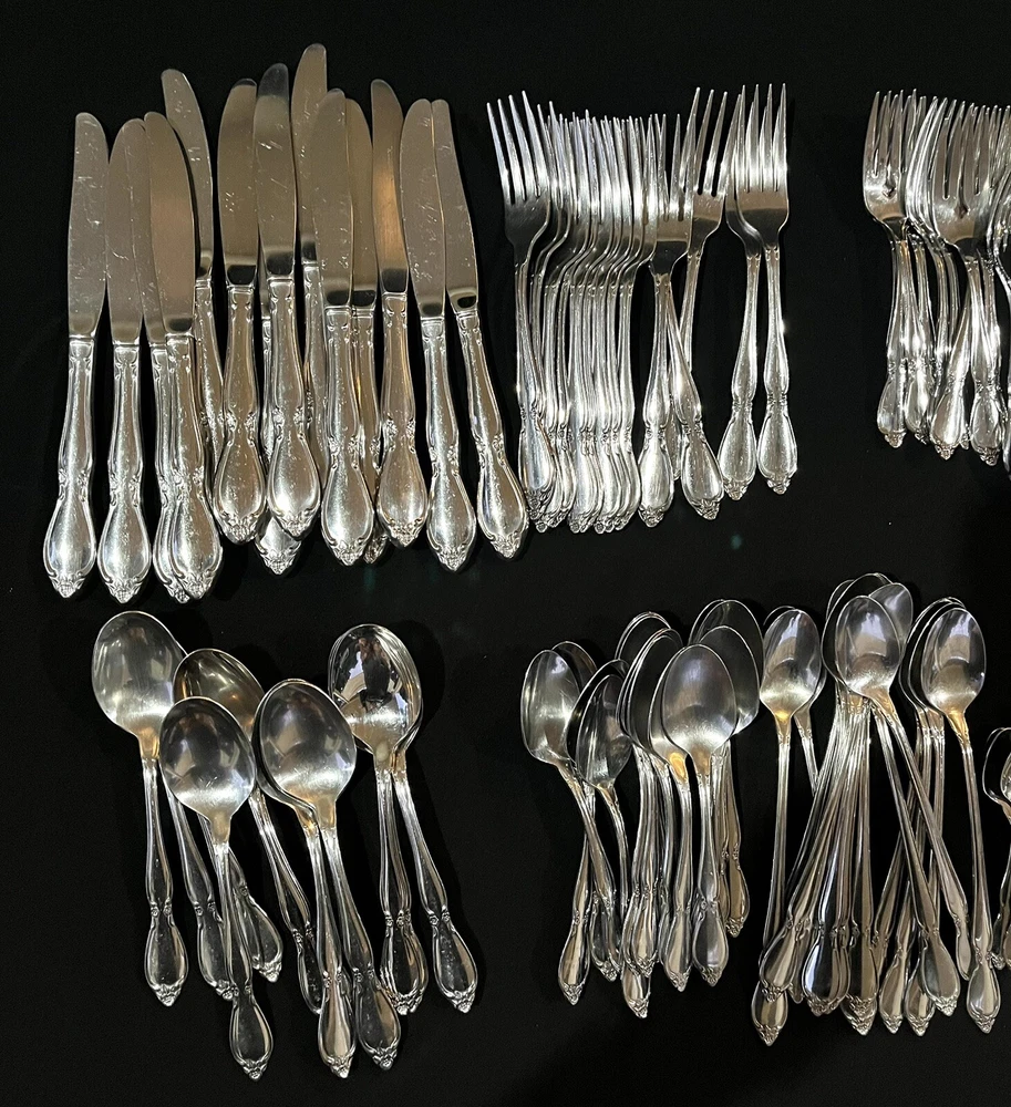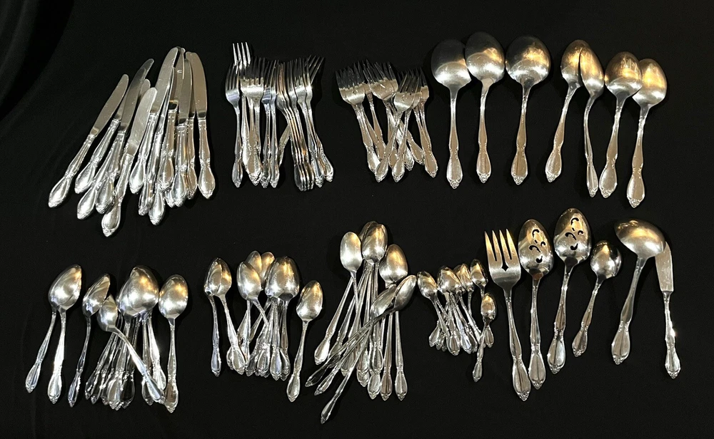This listing is for 109 pieces Oneida "Chatelaine" design stainless steel flatware lot. These are in contemporary style and made in the U.S.A. in the 1990's. Marking of "ONEIDA COMMUNITY STAINLESS " on the back side, knives have no marking. • Dinner Knife - 14 • Dinner Fork - 14 • Salad Fork - 14 • Table Spoon - 14 • Tea Spoon - 14 • Iced Tea Spoon - 14 • Demi Spoon - 12 • Soup Ladle - 1 • Serving Fork - 1 • Serving Spoon - 4 • Pierced Serving Spoon - 2 • Butter Knife - 1 • Sugar/Jam Spoon - 1 • Large Casserole Serving Spoon - 3 Total: 109 pieces The weight for this lot is about 10 lbs These are in silver-tone stainless steel flatware. Any other colors or tone are just light reflection. These are previously owned and in excellent used condition as shown. No issue I need to mention. A $1 bill is placed for size reference and not included. I do not wish to take return, so please review photos and ask all the necessary questions before purchasing this item. * * * Non-smoking environment! * * *