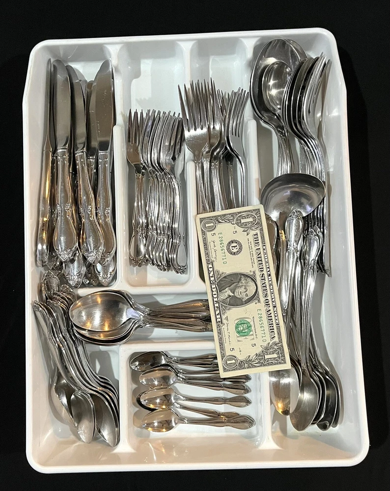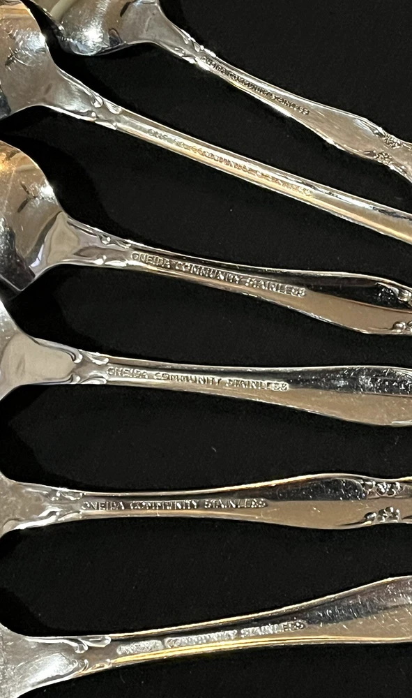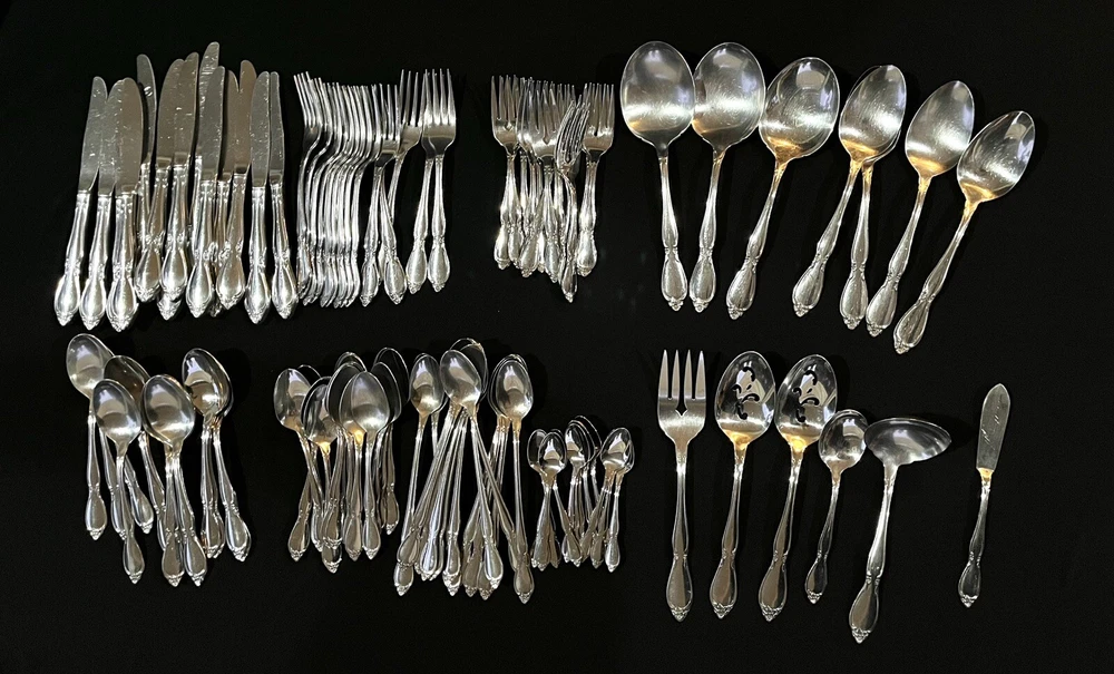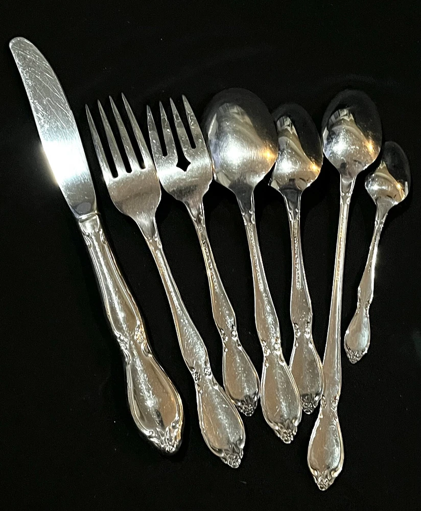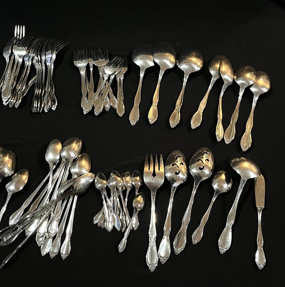 This listing is for 109 pieces Oneida "Chatelaine" design stainless steel flatware lot. These are in contemporary style and made in the U.S.A. in the 1990's. Marking of "ONEIDA COMMUNITY STAINLESS " on the back side, knives have no marking. • Dinner Knife - 14 • Dinner Fork - 14 • Salad Fork - 14 • Table Spoon - 14 • Tea Spoon - 14 • Iced Tea Spoon - 14 • Demi Spoon - 12 • Soup Ladle - 1 • Serving Fork - 1 • Serving Spoon - 4 • Pierced Serving Spoon - 2 • Butter Knife - 1 • Sugar/Jam Spoon - 1 • Large Casserole Serving Spoon - 3 Total: 109 pieces The weight for this lot is about 10 lbs These are in silver-tone stainless steel flatware. Any other colors or tone are just light reflection. These are previously owned and in excellent used condition as shown. No issue I need to mention. A $1 bill is placed for size reference and not included. I do not wish to take return, so please review photos and ask all the necessary questions before purchasing this item. * * * Non-smoking environment! * * *