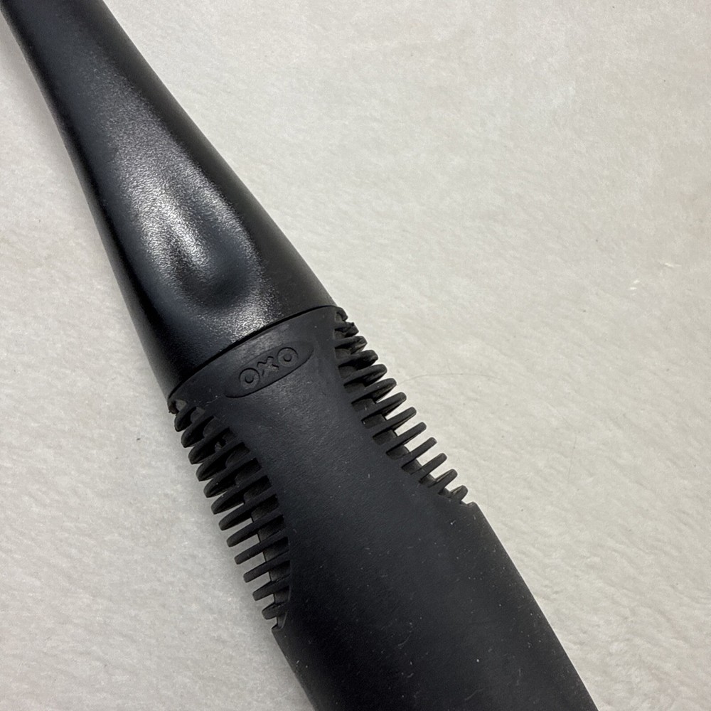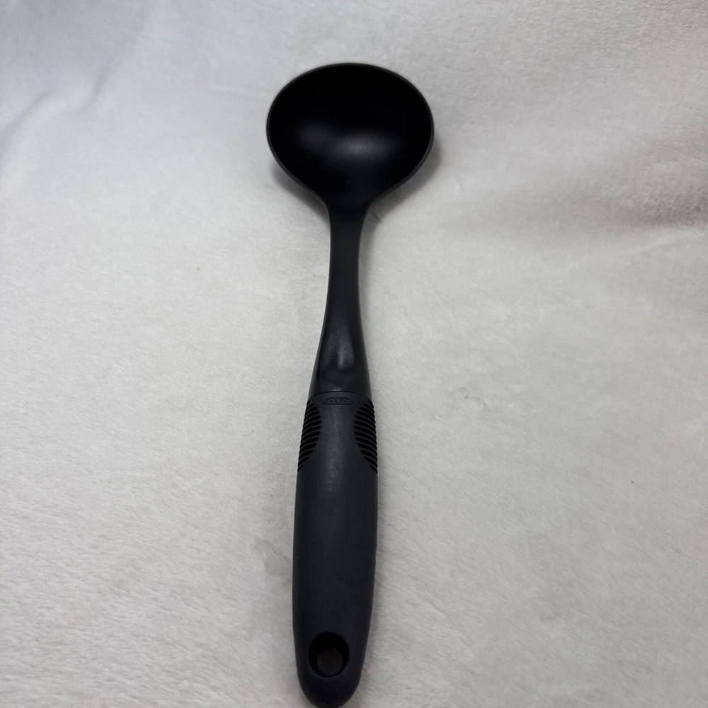 Vintage OXO Good Grips Black Nylon Soup Ladle with a soft comfortable grip. This soup ladle is solid black in color and made of plastic with a nylon handle. It is dishwasher safe and designed by the brand OXO. The set includes one soup ladle perfect for serving soups and stews.