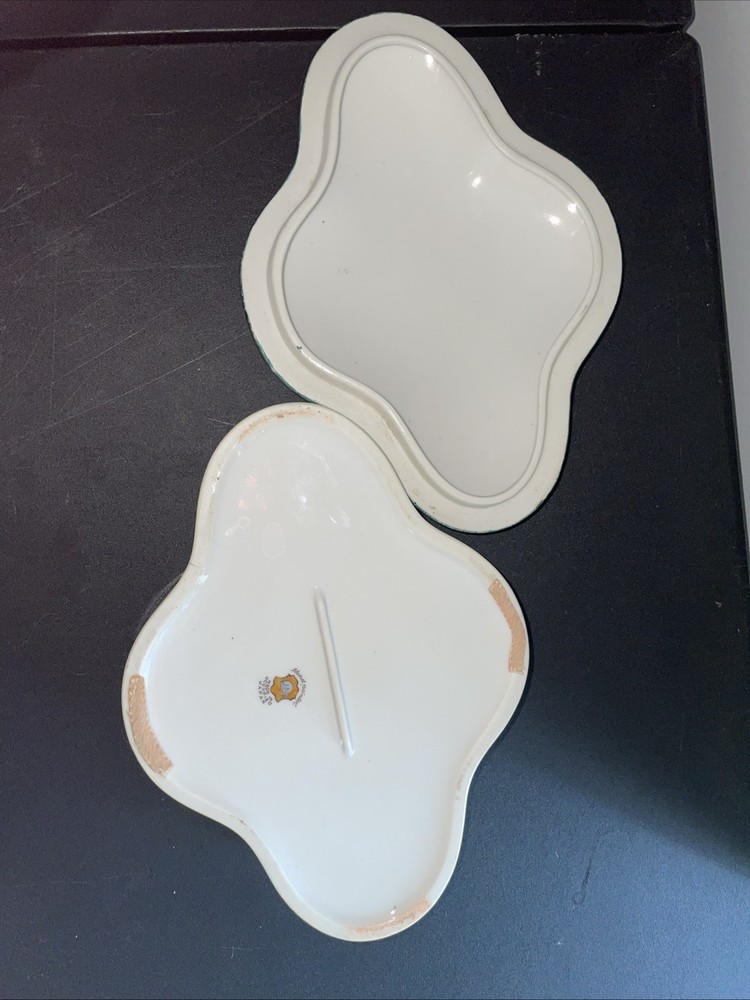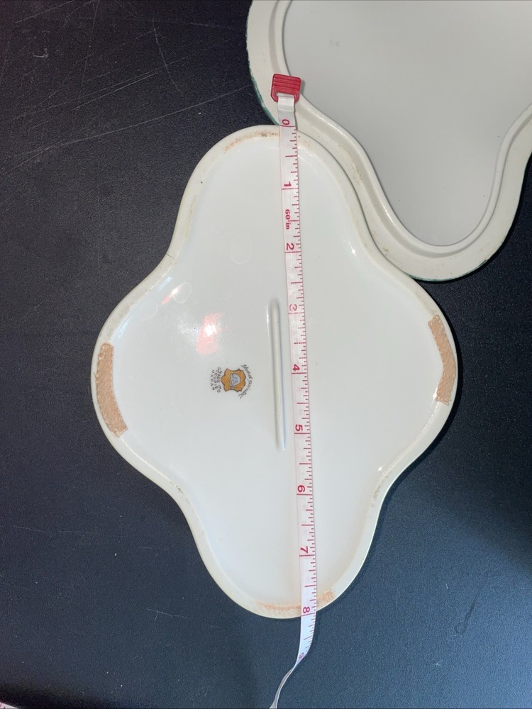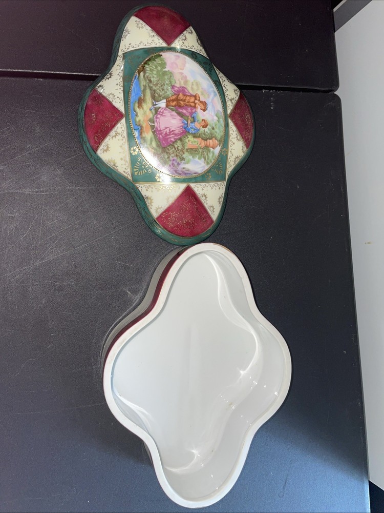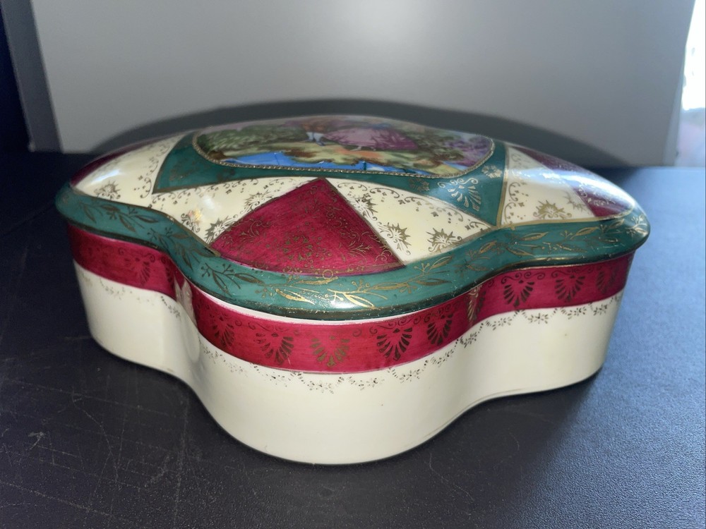 This decorative ceramic trinket box features a vintage design with intricate painted details. Made of porcelain, it has an asymmetrical shape in a multicolor finish, measuring 2 inches in height, 6 inches in length, and 8 inches in width. With its unique and large size, this trinket box is a stylish and eye-catching piece that would make a great addition to any collection or home decor. Made in Japan, it showcases a blend of craftsmanship and classic design that is sure to be a standout piece.