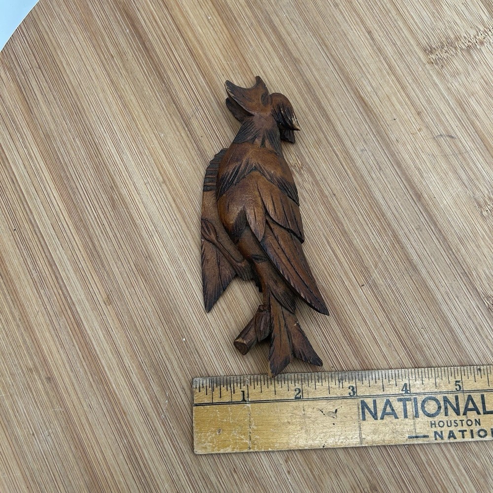 The product is a vintage German Black Forest Cuckoo Clock with intricate carvings and a 6" trim featuring a bird design. The clock is in a multicolor scheme, adding a unique and decorative touch to any space. This collectible piece would make a charming addition to any clock or decorative item collection, showcasing traditional German craftsmanship and design.