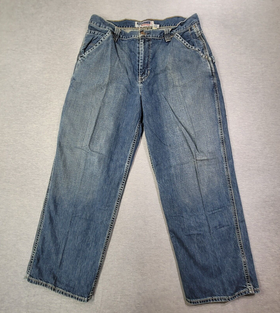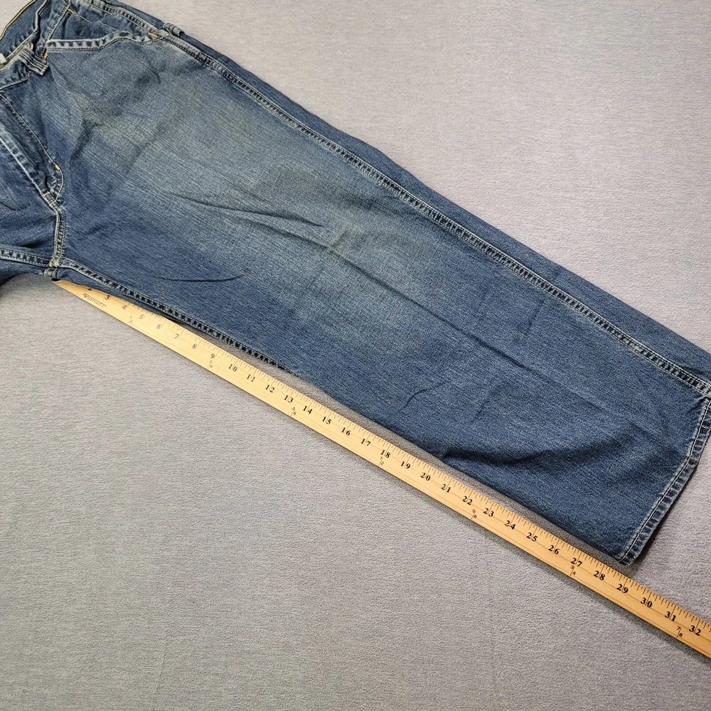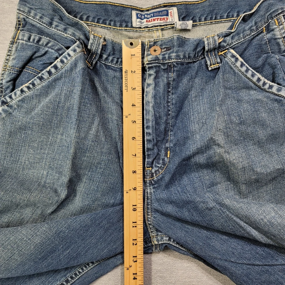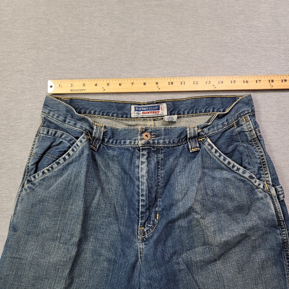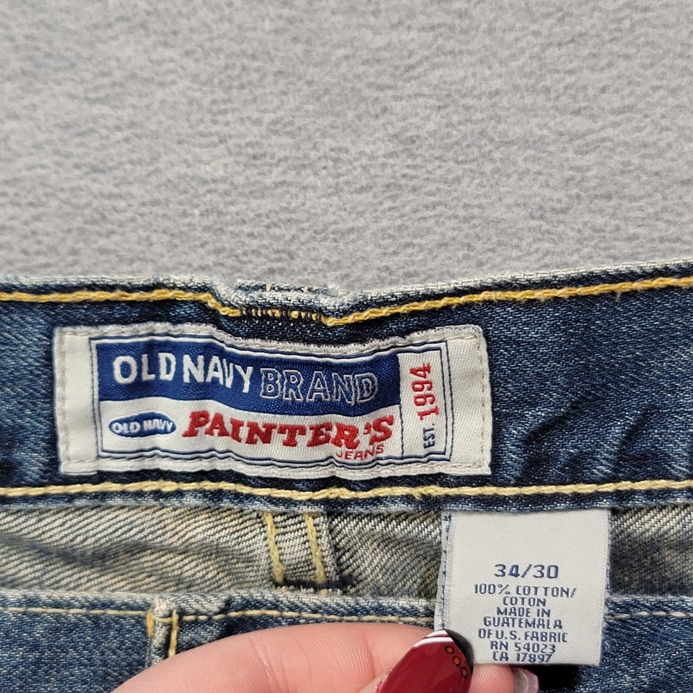 The product is a pair of Old Navy Carpenter Jeans for men in size 34 waist and 29 inseam. They are a relaxed fit with a straight leg style, made of blue faded denim material. The jeans feature a zip closure, mid-rise waist, and are designed with a solid pattern suitable for work or casual wear. The fabric wash is medium, and the brand is Old Navy, known for its quality and comfort in men's clothing.