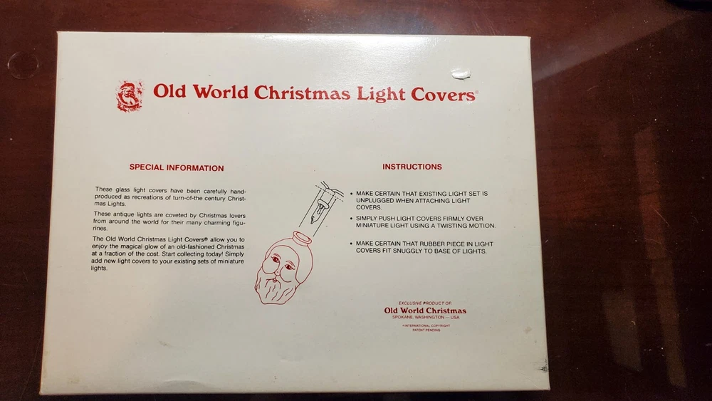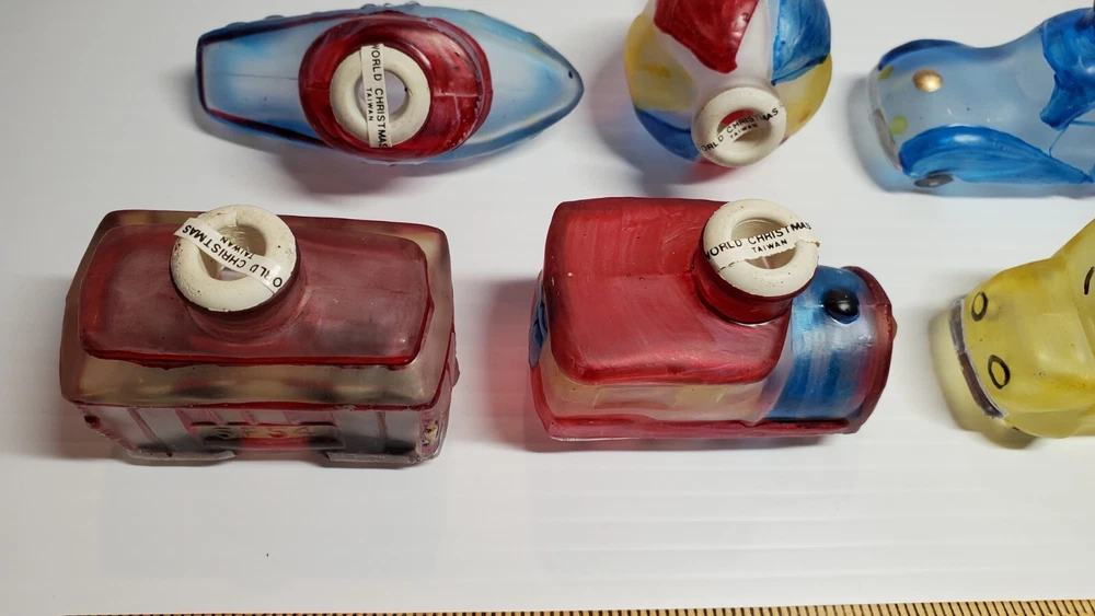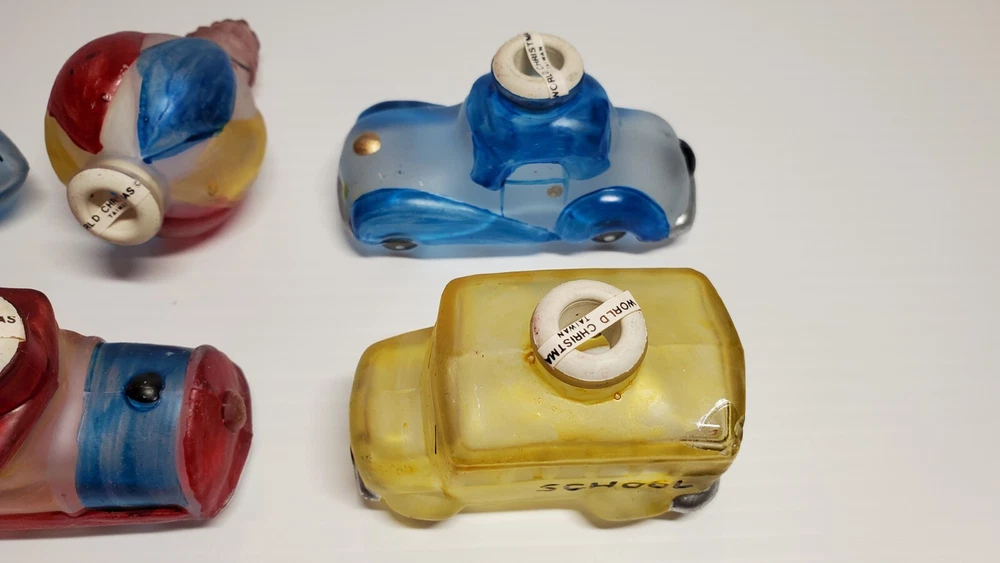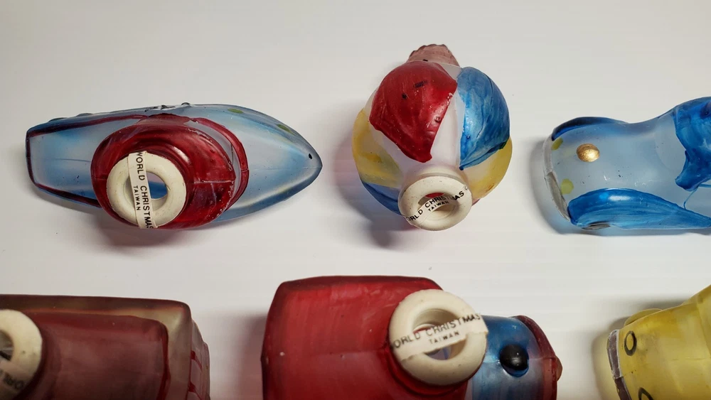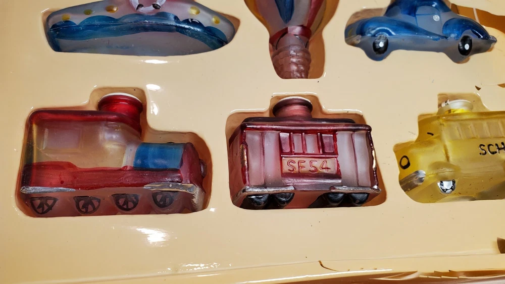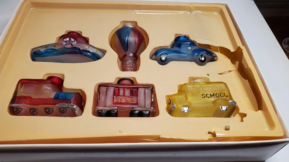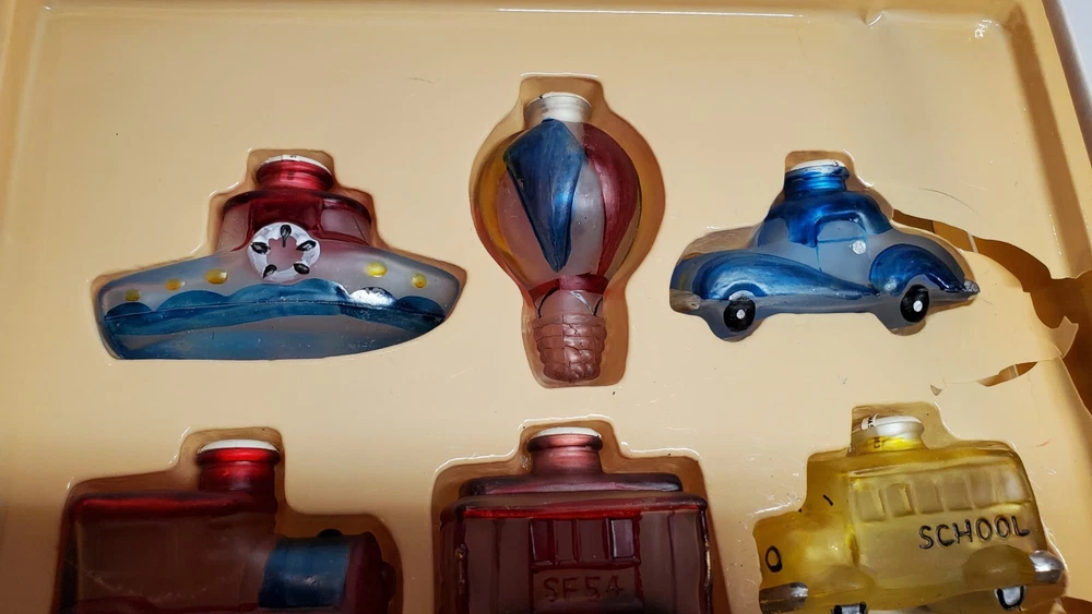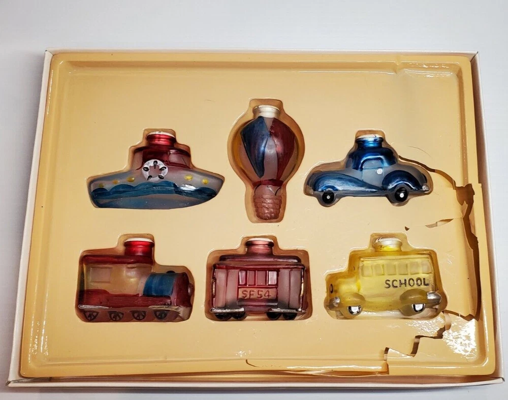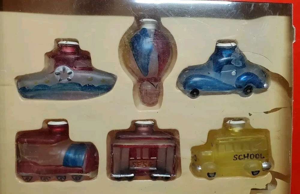 Vintage Old World Christmas Co Light Bulb Glass Covers. 6 PC Set in Box: This set is unused, The seals over the openings to the light covers are still in place. Unfortunately, at some point in its long life in storage, Something heavy was placed on top of the box and chipped the back corner of the yellow glass bus. Not bad, the chis is shallow. (Please see photos). Everything else in is nice vintage condition, ready to be used. Set includes: Boat, Balloon, Car, Locomotive, Caboose and Bus