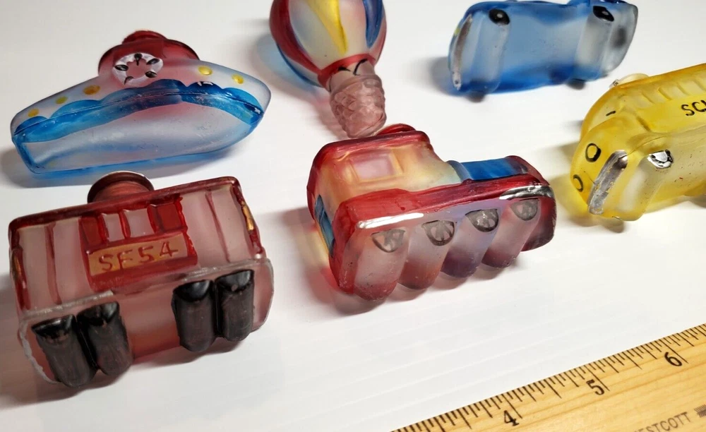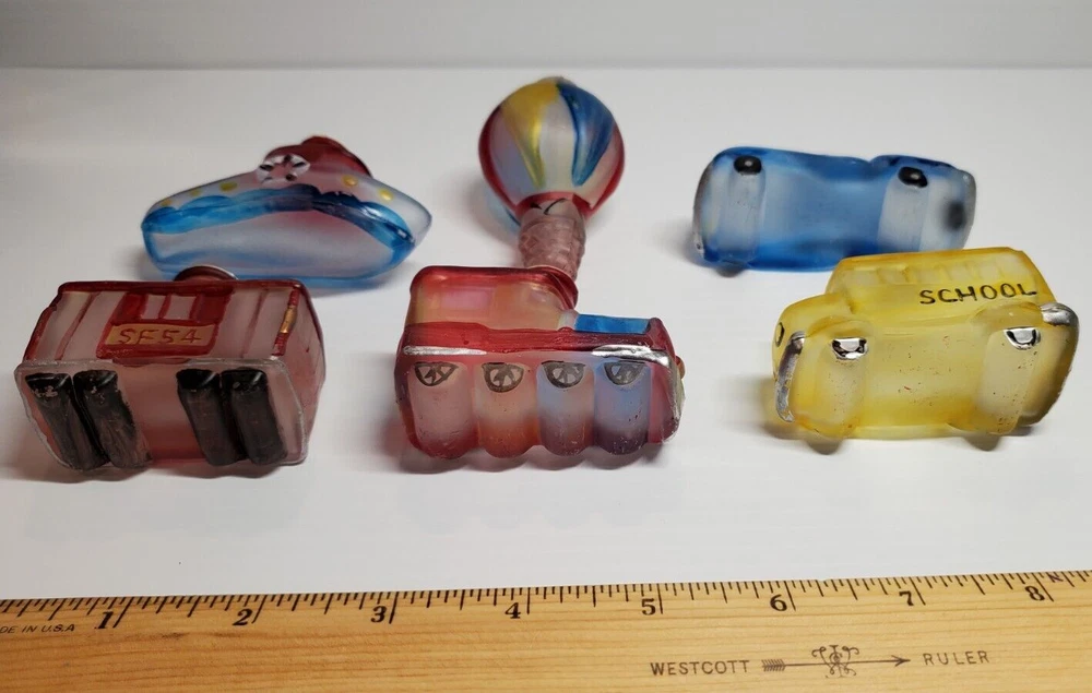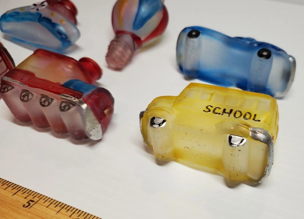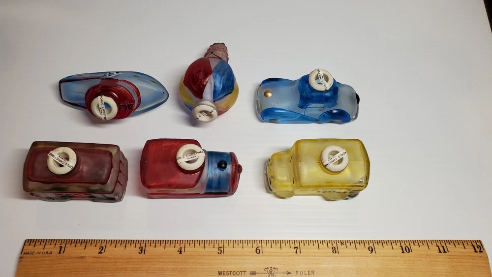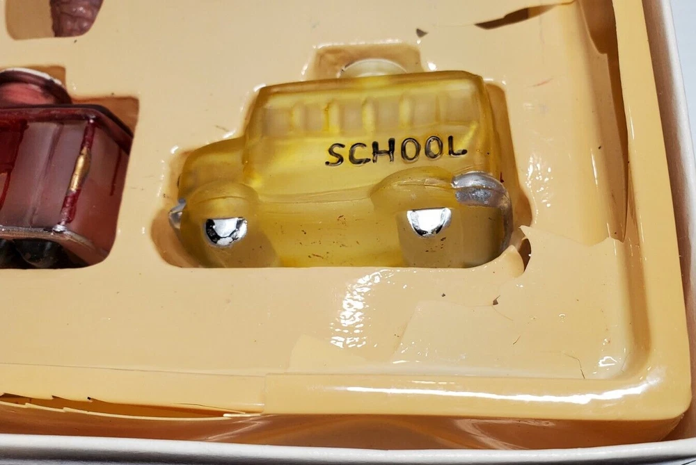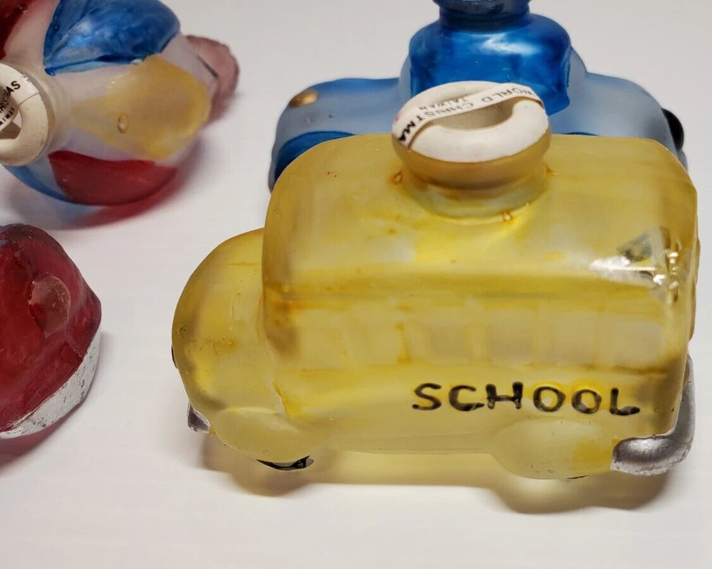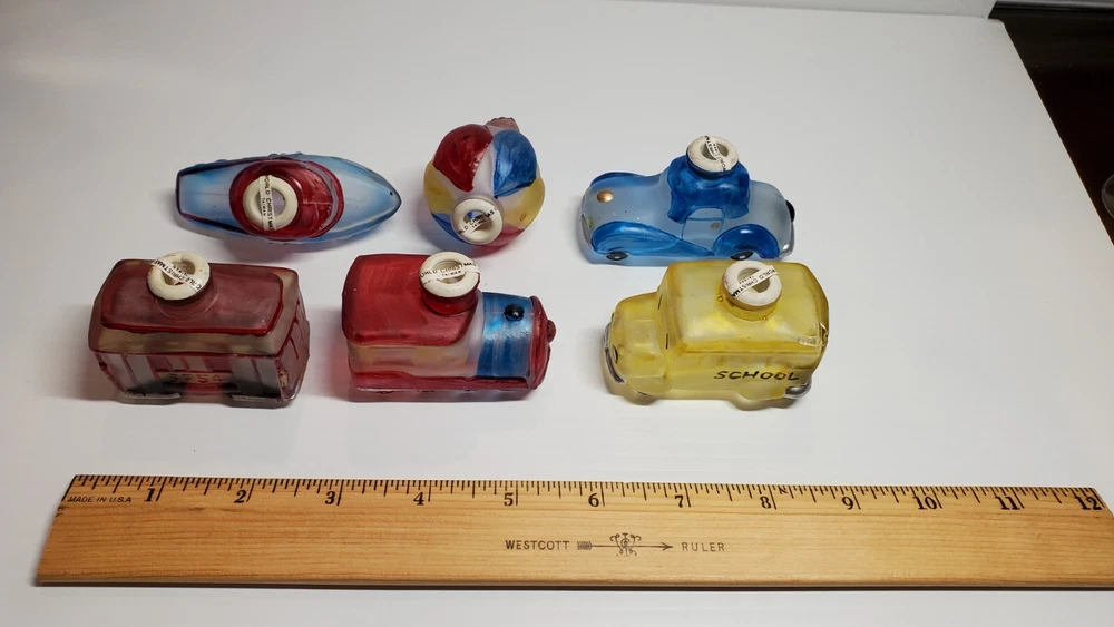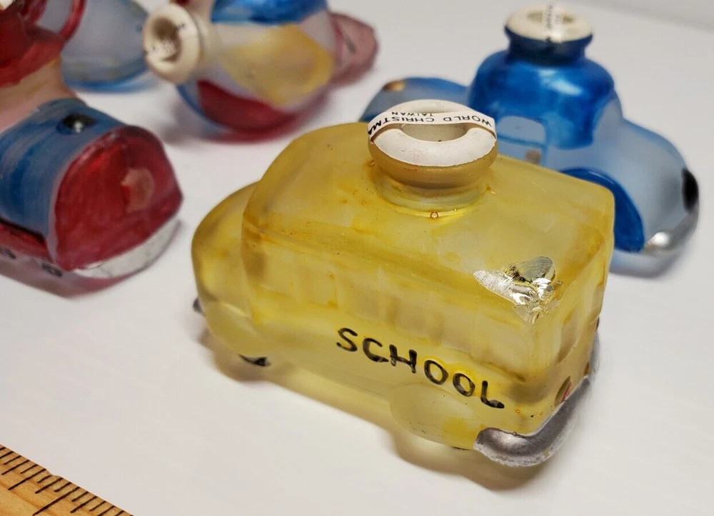 Vintage Old World Christmas Co Light Bulb Glass Covers. 6 PC Set in Box: This set is unused, The seals over the openings to the light covers are still in place. Unfortunately, at some point in its long life in storage, Something heavy was placed on top of the box and chipped the back corner of the yellow glass bus. Not bad, the chis is shallow. (Please see photos). Everything else in is nice vintage condition, ready to be used. Set includes: Boat, Balloon, Car, Locomotive, Caboose and Bus