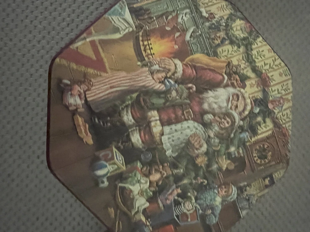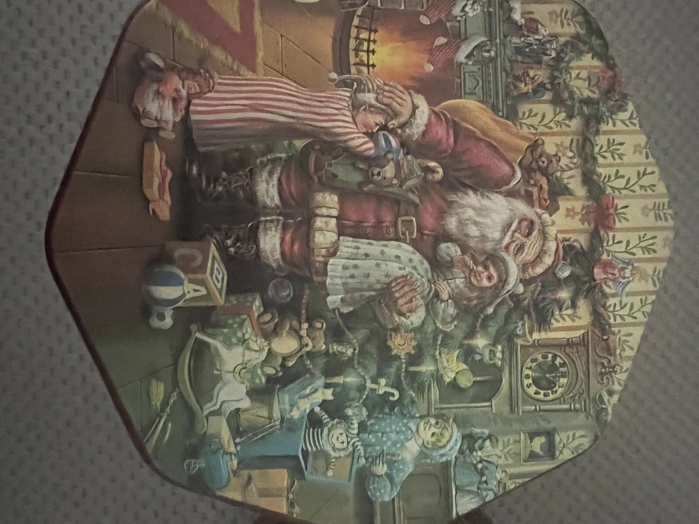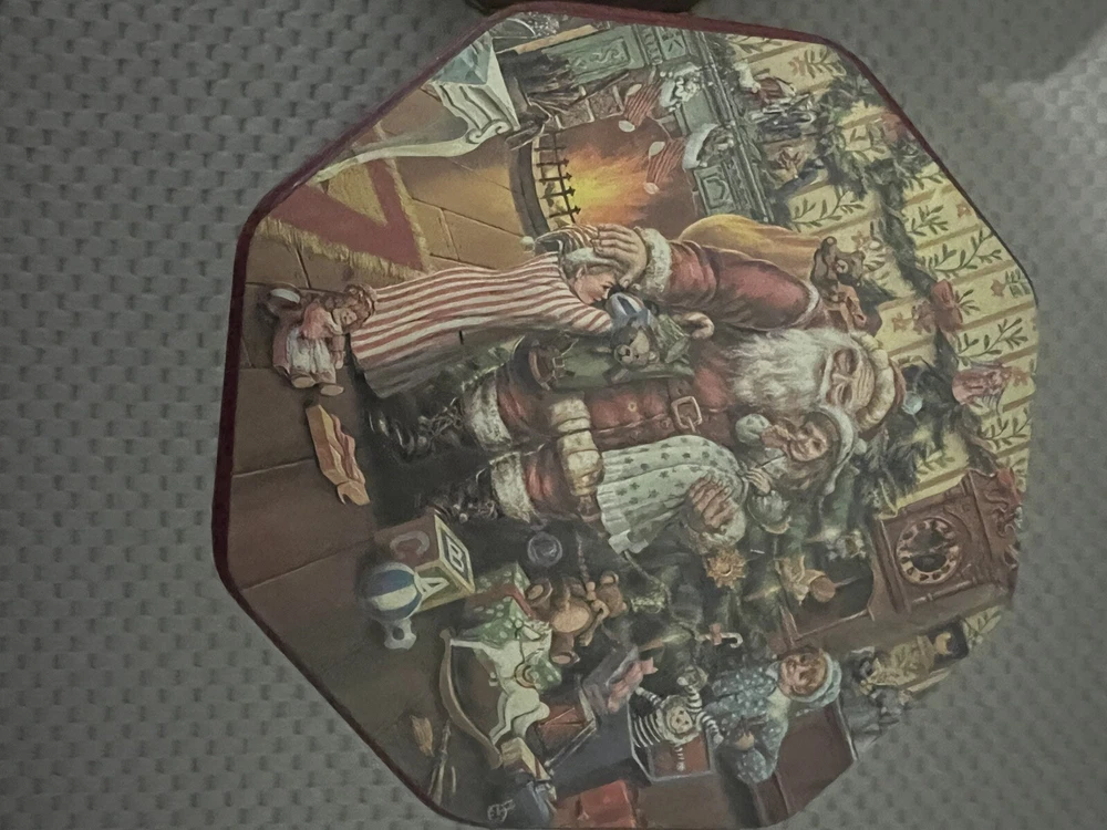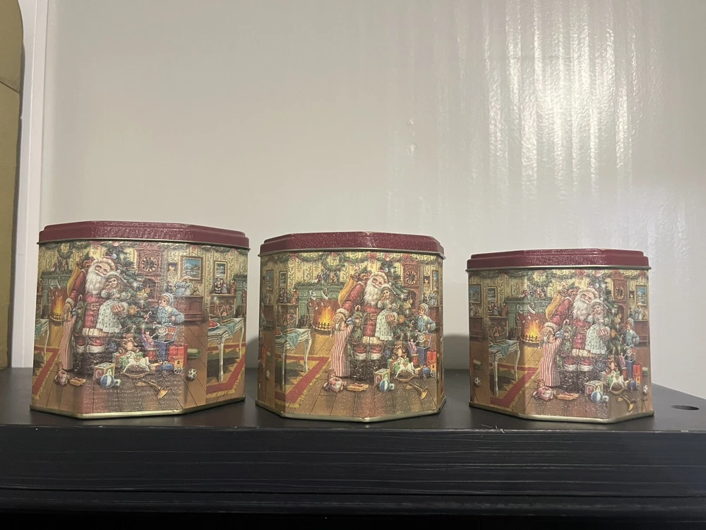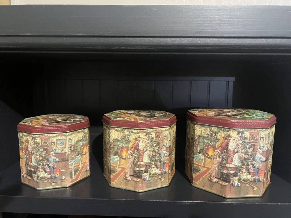 Vintage tin set featuring Old World Santa with kids and presents at a fireplace, perfect for Christmas. The set includes three figurines measuring 4 inches, 3 1/4 inches, and 3.5 inches in height, all in a multicolor design.Hexagon shape