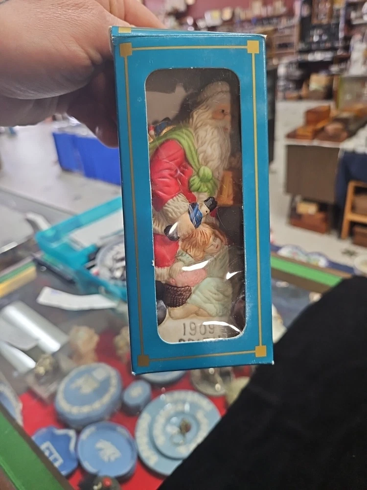 This is a vintage Santa figurine from the Limited Editions collection by Old World Collectibles. The figurine features a traditional Santa in bisque finish with multicolor details. It measures 5 inches in height and 2 inches in width, and is made of porcelain. The figurine comes in a box and is a licensed reproduction from the late 20th century.