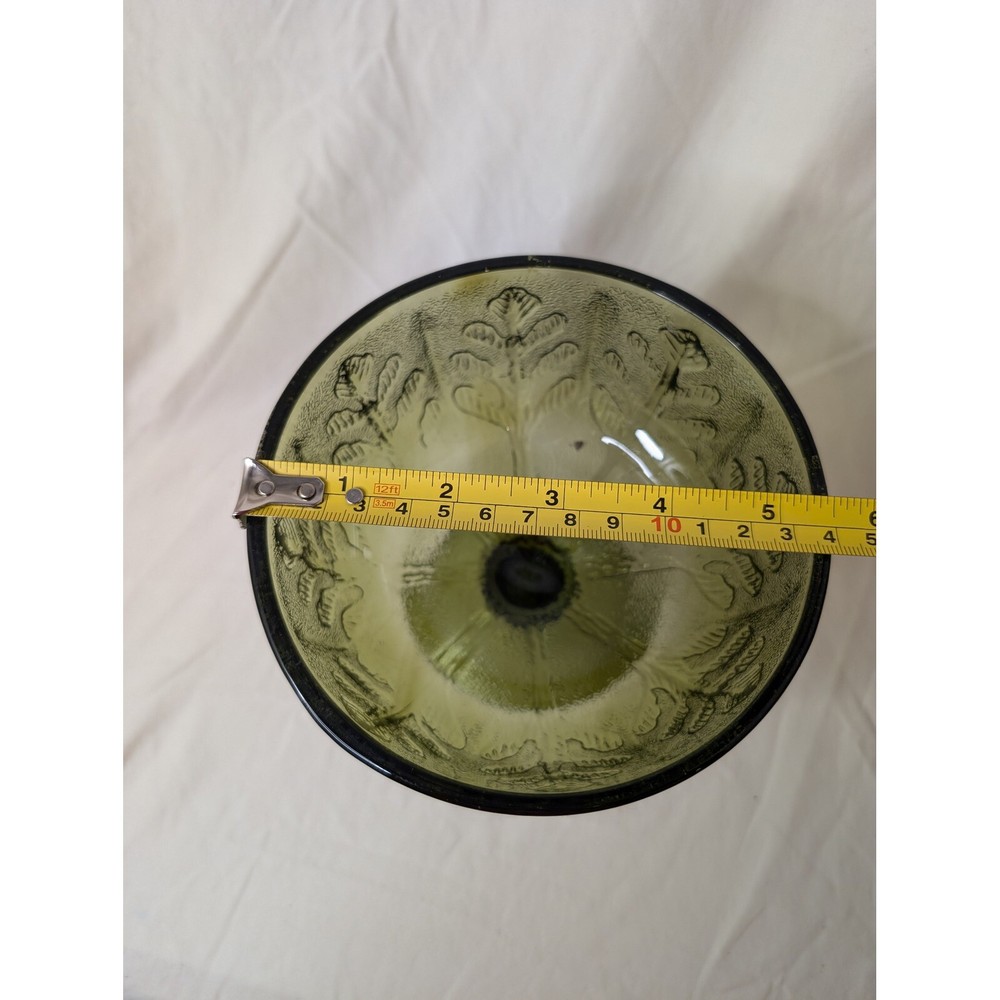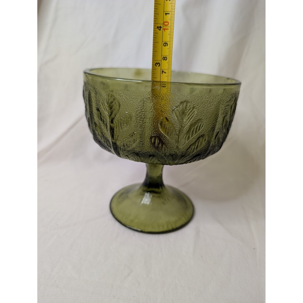Evoke a sense of vintage charm with this FTD olive green glass compote bowl. The footed design and delicate floral pattern add a touch of elegance to any table setting. This versatile piece is perfect for serving desserts, displaying decorative items, or simply adding a pop of color to your home decor. Imagine it filled with fresh fruit at a brunch gathering, this piece has a slight service scratch that I tried my best to capture in a photo showcasing potpourri on a vanity, or holding candies during the holidays. Material: Glass Type: Dessert Bowl Color: Green Pattern: Floral Keywords: FTD, compote bowl, olive green, glass bowl, vintage bowl, footed bowl, dessert dish, floral design, table decor, home decor, vintage glass, decorative bowl, centerpiece