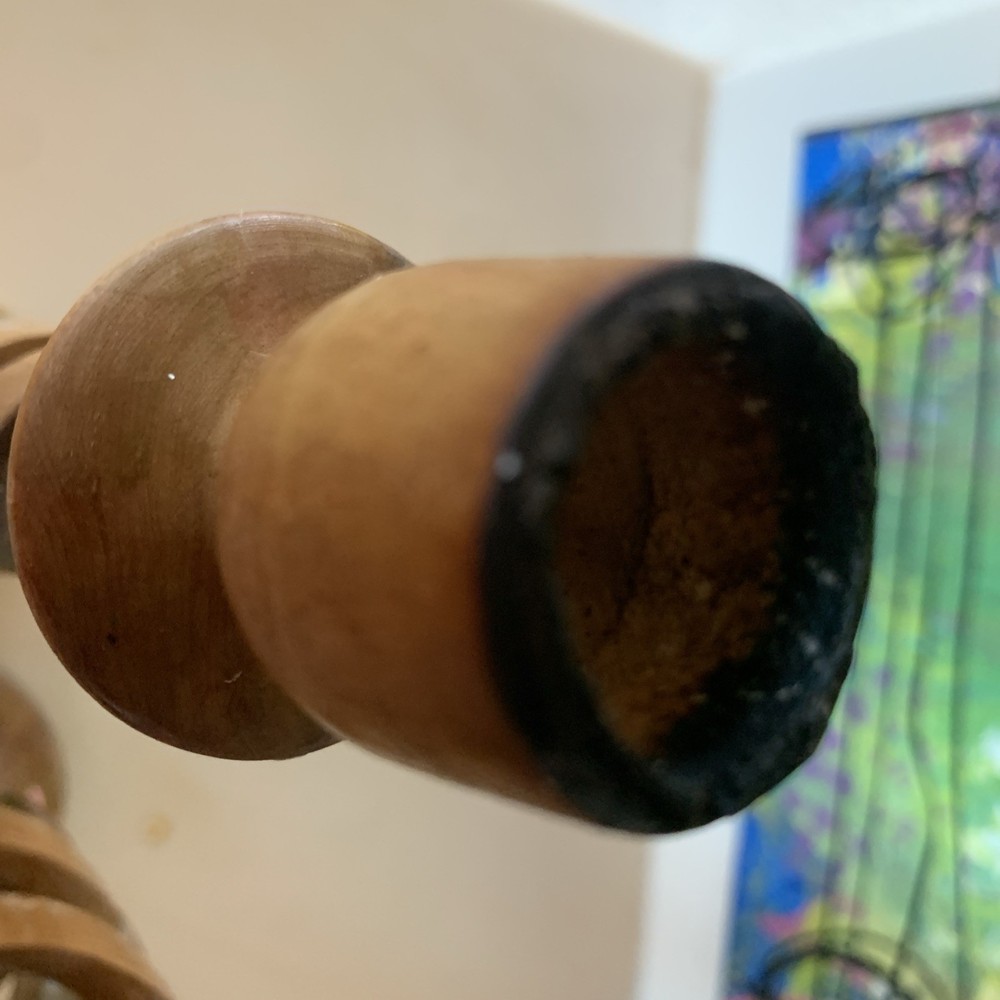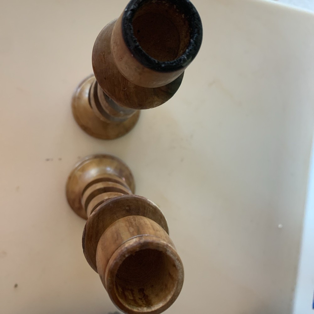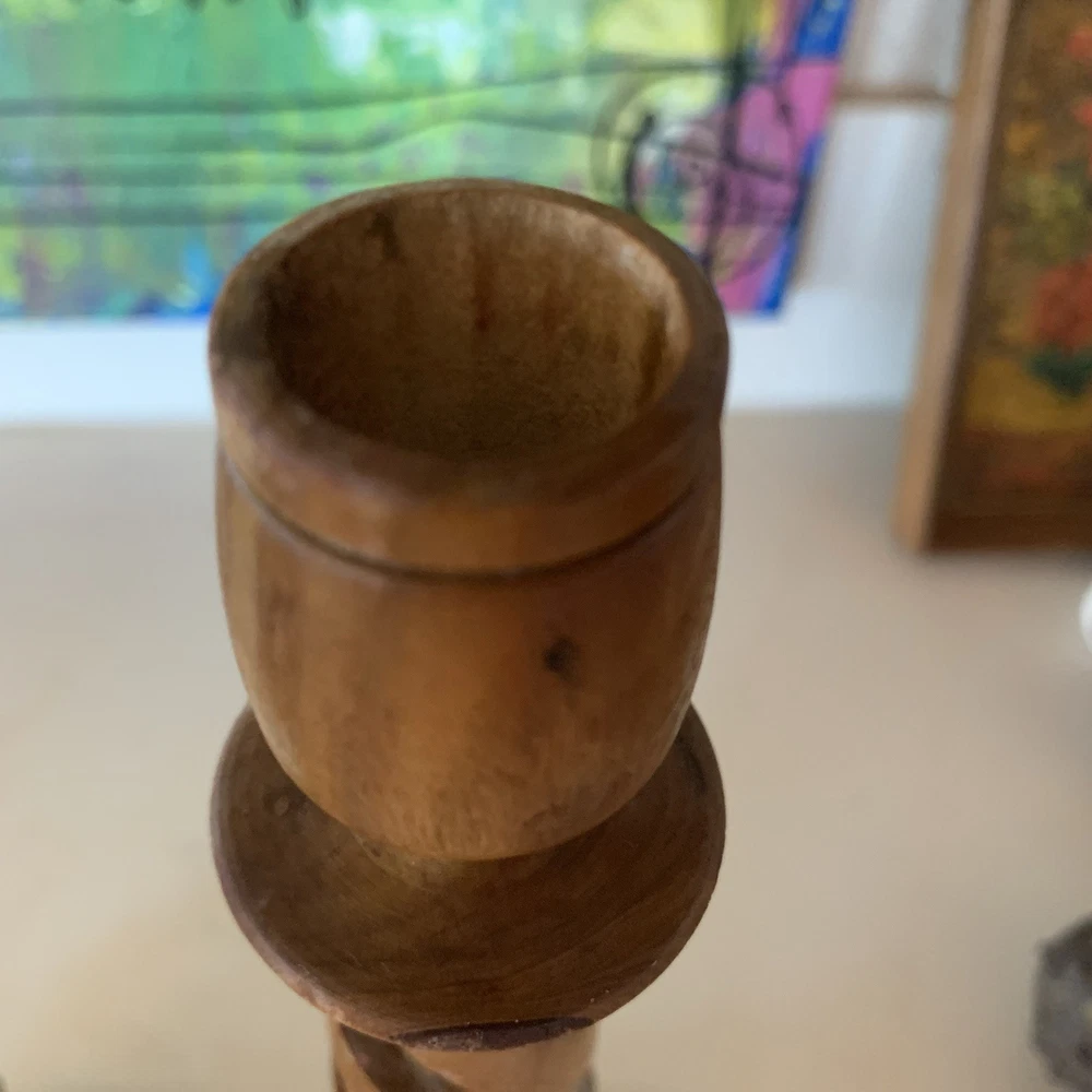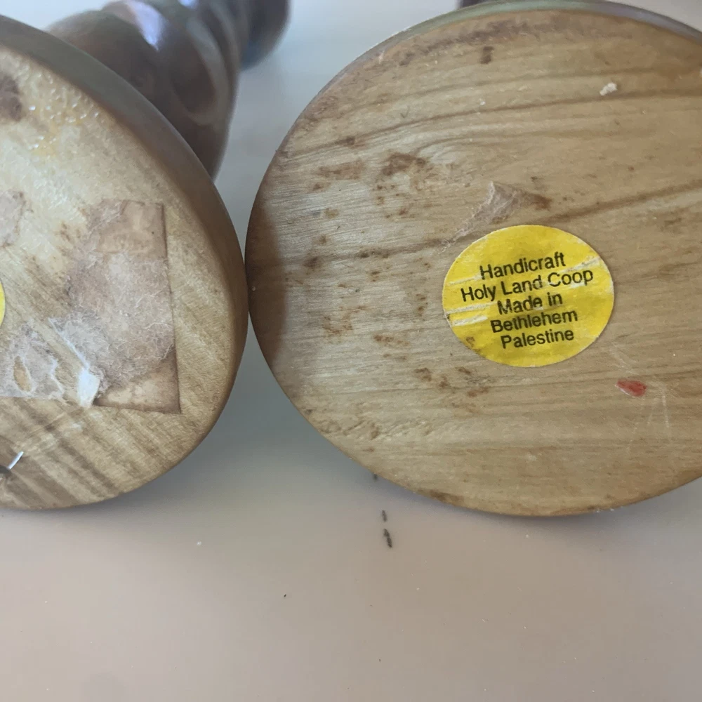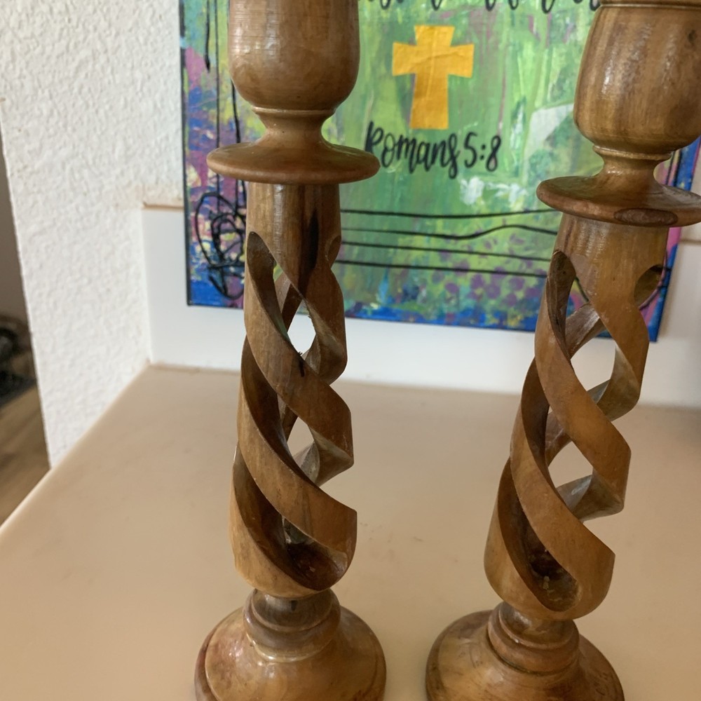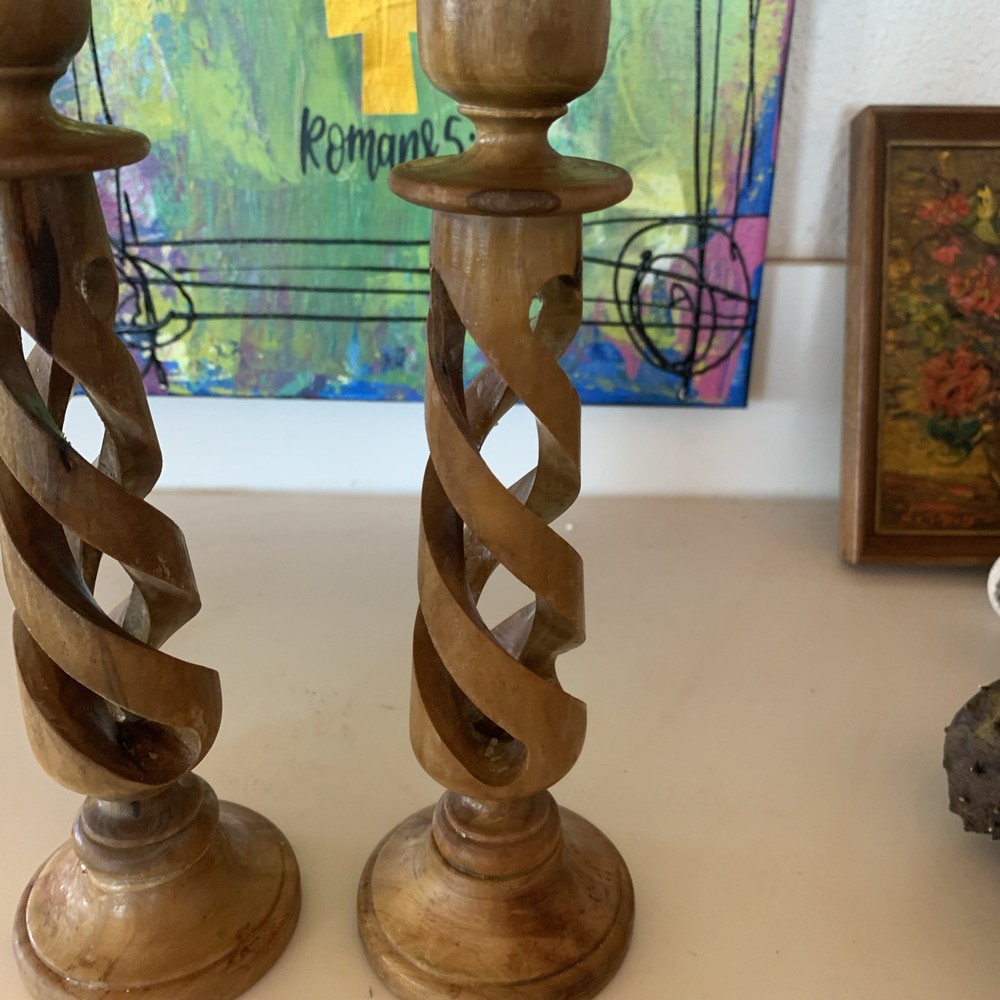 This vintage pair of carved olive wood open barley twist candleholders, made in Bethlehem, features intricate carvings and a Gothic style design. With a brown color and measuring 8.5 inches in length, these candle holders are perfect for all occasions and add a touch of cottage charm to any decor. The unique barley twist pattern and original craftsmanship make them a decorative collectible item that brings character and history to your home.