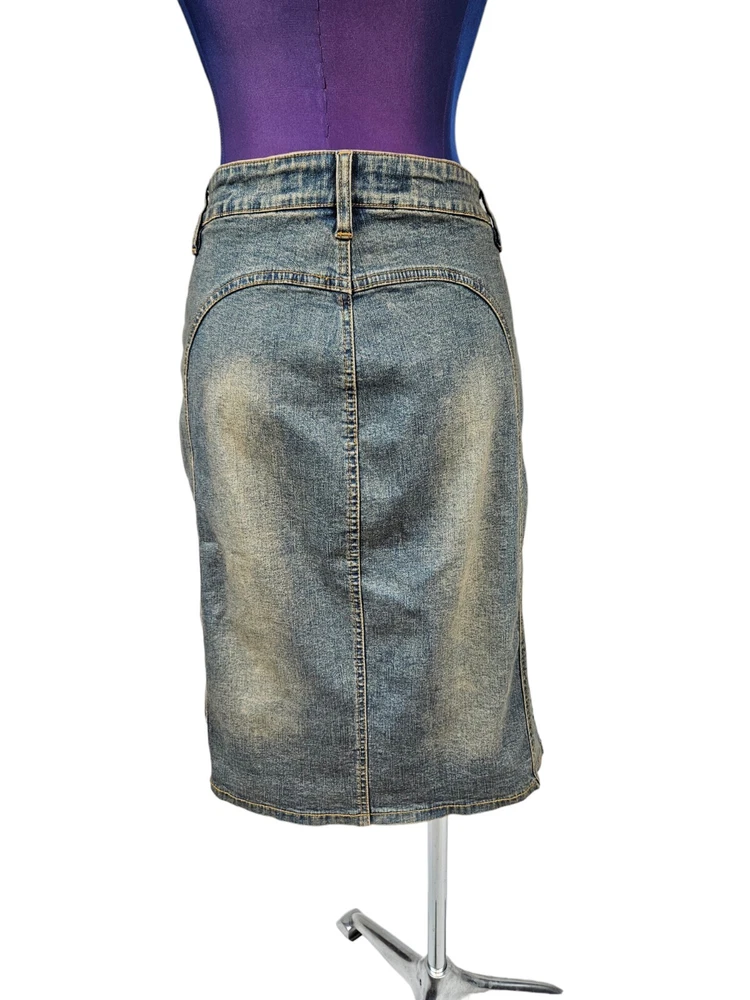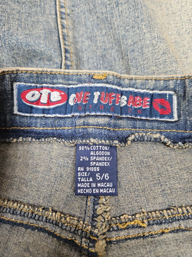 Vintage One Tuff Babe Y2K Corset Lace Up Front Slit Jean Midi Skirt Size 5/6 H39 In excellent condition Vintage One Tuff Babe Y2K Corset Lace Up Front Slit Jean Midi Skirt Size 5/6 Juniors Features 90s Y2K style vintage OTB One Tuff Babe faded medium wash denim jean skirt, corset lace up closure, mid rise, 2 small coin pockets, front slit, stretch, exposed seams, 90s vibes. Measurements laying flat waist 14" hips 18" length 21.5" Fabric cotton, spandex This is a pre-owned item that may show signs of wear. In excellent condition, no flaws.