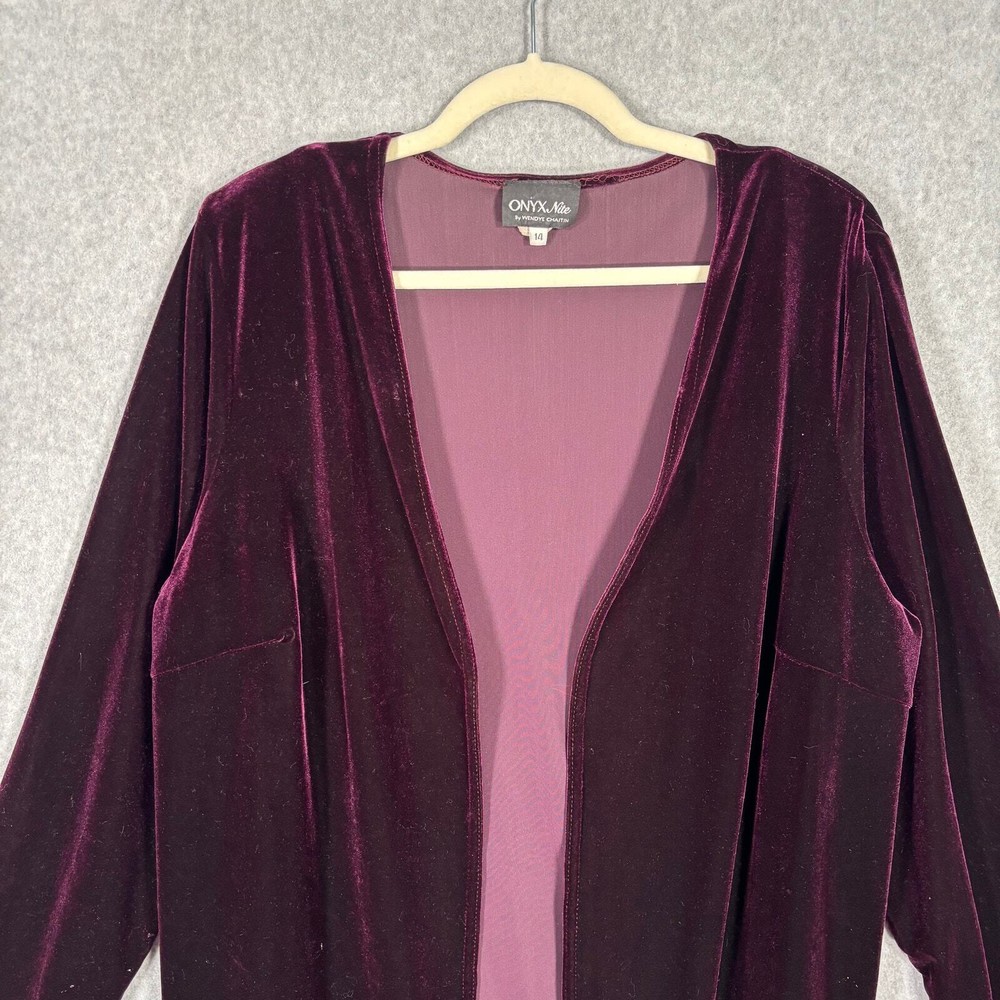 Vintage Onyx Nite Velvet Cardigan Womens Size 14 Burgundy Duster Long Over Coat Open Bracelet Sleeve Length Shoulder Pads EXCELLENT Vintage condition: minimal to no signs of wear, no stains or holes SKU 5822 **Please see all pictures for full item condition and details** - Ships Same/Next Day, Professional Seller, Offers Welcome, Like or watch for price drops - Item in photos is exact item you will receive - I list new items daily, be sure to browse my store/closet for more items - Bundle pricing and combined shipping available for additional savings - Feel free to send a message