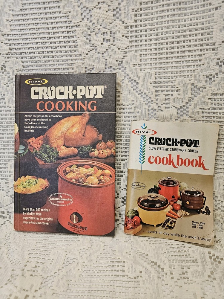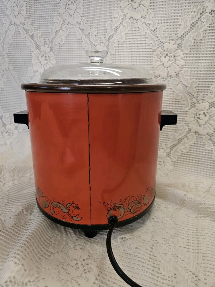 This vintage orange Rival 3100/2 slow cooker has a capacity of 3.5 qt and operates with 120 V of electric power. It features a glass, ceramic, and metal construction with a power of 150 W. The cooker includes a lid and offers 2 settings/programs. Also included are a Good Housekeeping Crockpot & Rival Crockpot Cookbook. tested
