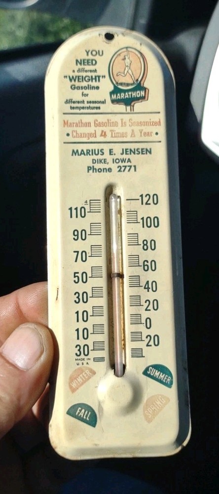 Theme: Gas & Oil Date of Creation: Unknown Brand: Marathon Gasoline Original/Reproduction: Original Country of Origin: United States Color: Multi-color California Prop 65 Warning: N/a Type of Advertising: Thermometer
