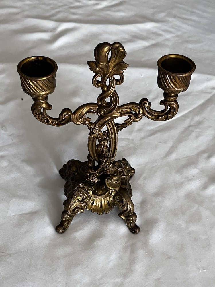 This vintage pair of ornate brass candelabra candle holders features a Baroque/Rococo style with an asymmetrical shape and scroll pattern. The antique brass finish adds a touch of elegance, making them suitable for all occasions and perfect for adding a touch of design to any living or dining room. These candle holders are unboxed and easy to clean with a damp cloth, making them a practical and stylish addition to any collection of decorative collectibles. Size 8 x 6 x 3 1/2 inches.