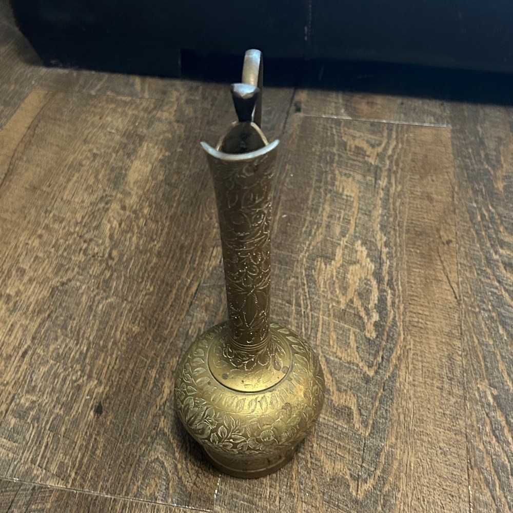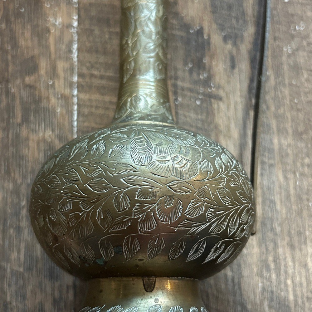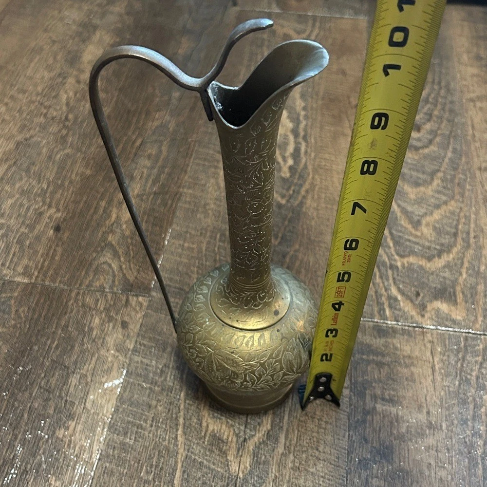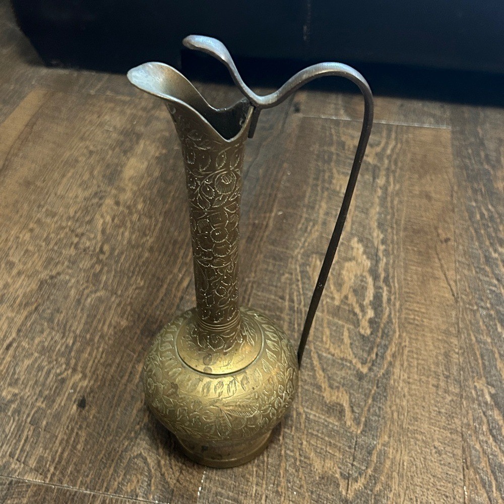 Elegant brass pitcher with intricate designs. Perfect for home decor. Made in India Marked on Bottom